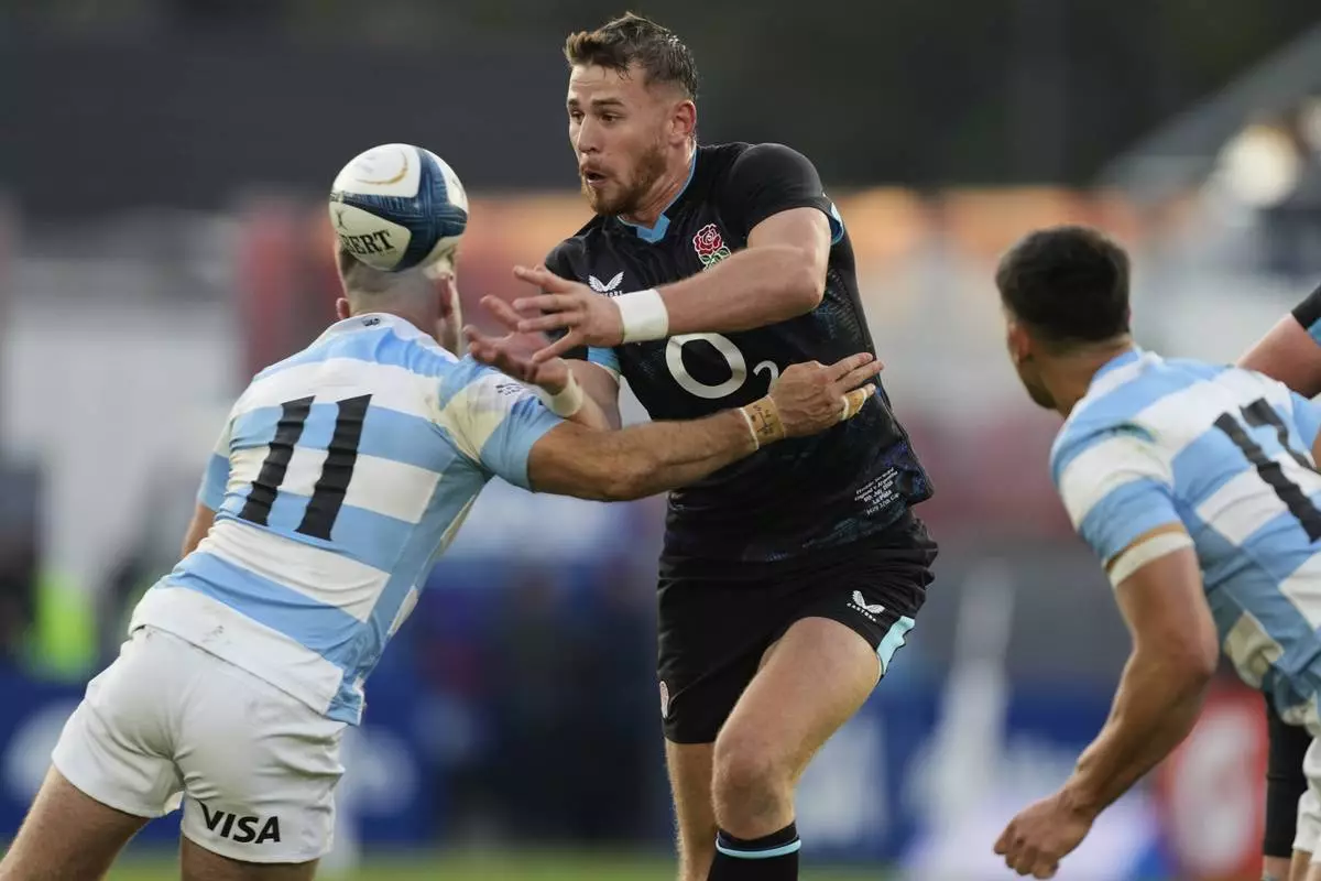 England's Freddie Steward, center, is tackled by Argentina's Santiago Cordero during a rugby test match in La Plata, Argentina, Saturday, July 5, 2025. (AP Photo/Gustavo Garello)