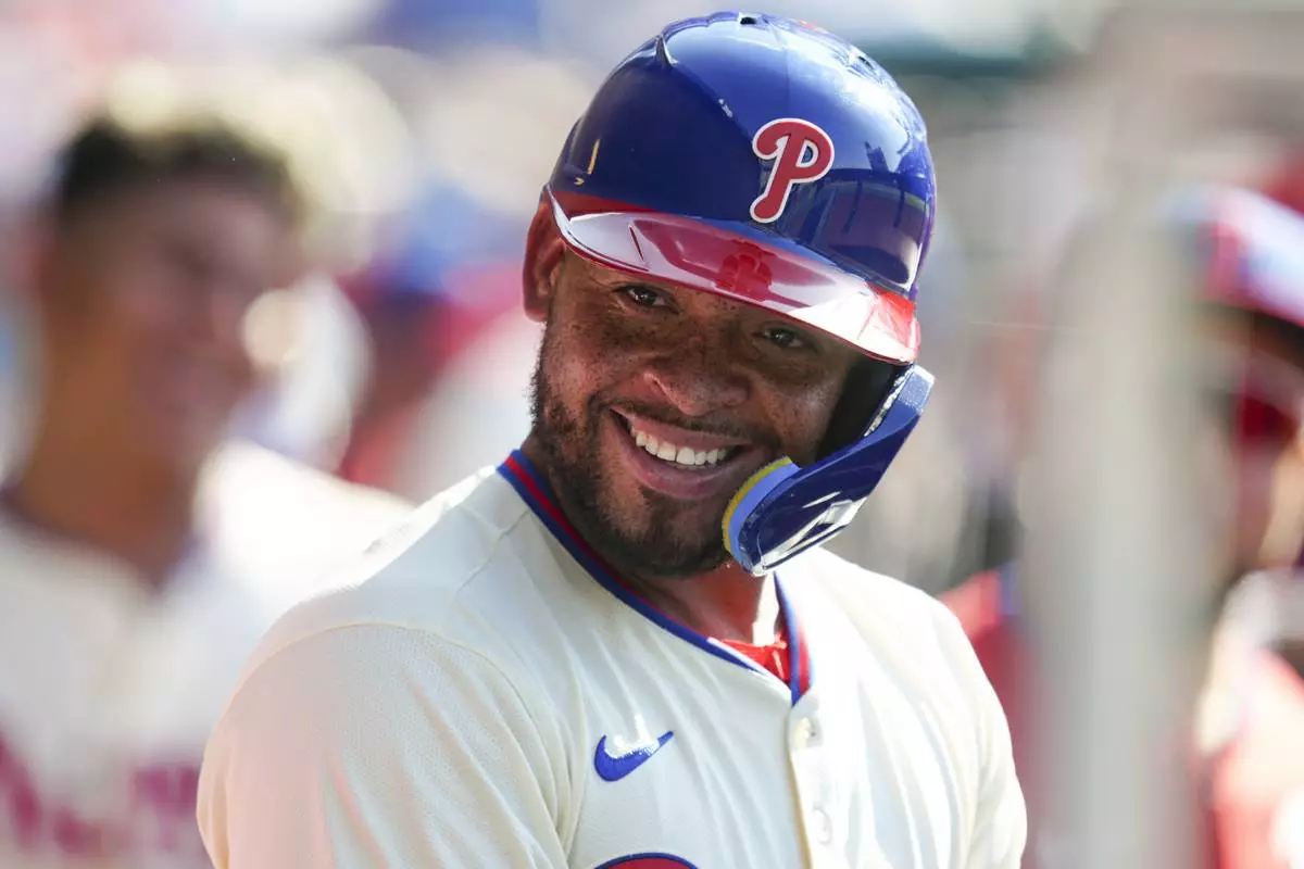 Philadelphia Phillies' Edmundo Sosa smiles in the dugout after hitting a solo home run off Cincinnati Reds pitcher Nick Lodolo during the fifth inning of a baseball game, Saturday, July 5, 2025, in Philadelphia. (AP Photo/Derik Hamilton)