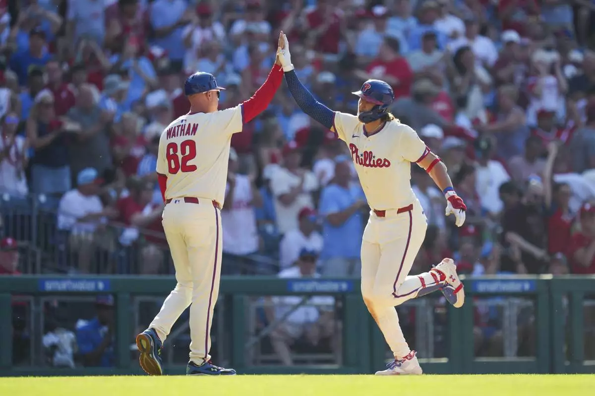 Phillies starter Ranger Suárez was pulled by manager Rob Thomson after throwing just 80 pitches in five innings. He struck out six and lowered his ERA to 1.99, putting the left-hander in prime position to make his second straight All-Star team.