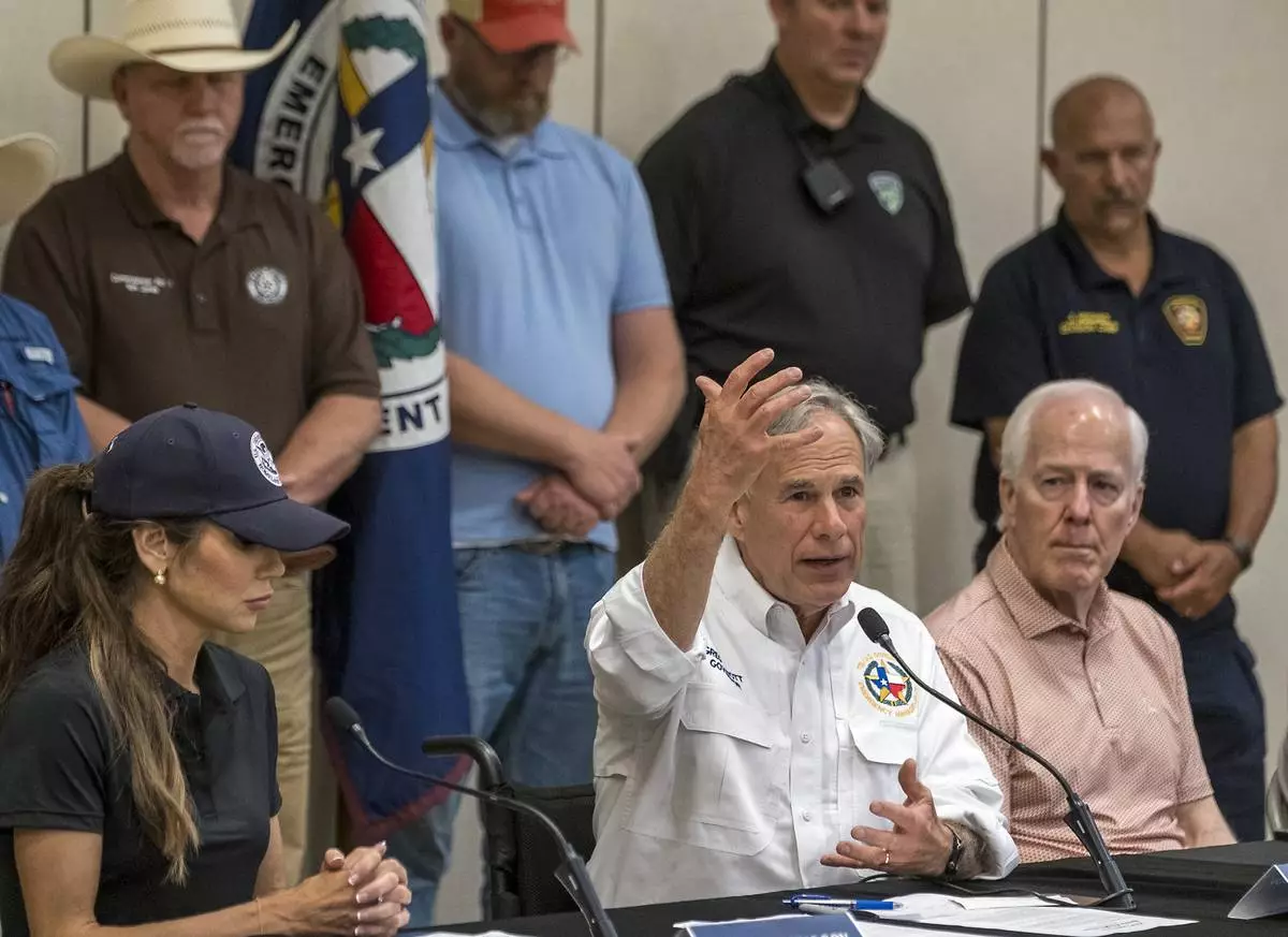 Texas Gov. Greg Abbott, center, speaks to media during a press conference as Homeland Security Secretary Kristi Noem, left, and Sen. John Cornyn listen, after recent flooding along the Guadalupe River during a press conference on Saturday, July 5, 2025, in Kerrville, Texas. (AP Photo/Rodolfo Gonzalez)