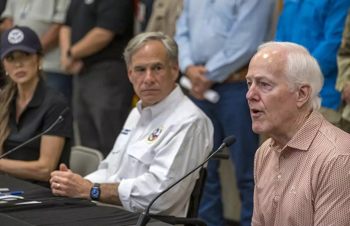 Sen. John Cornyn, right, speaks to media during a press conference as Homeland Security Secretary Kristi Noem, left, and Gov. Greg Abbott, center, listen after recent flooding along the Guadalupe River during a press conference on Saturday, July 5, 2025, in Kerrville, Texas. (AP Photo/Rodolfo Gonzalez)