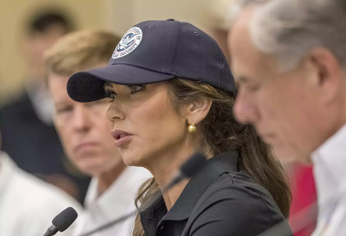Homeland Security Secretary Kristi Noem, center, and Texas Gov. Greg Abbott, right, discuss the ongoing search and rescue efforts after recent flooding along the Guadalupe River during a press conference on Saturday, July 5, 2025, in Kerrville, Texas. (AP Photo/Rodolfo Gonzalez)