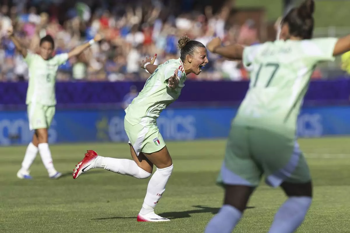 Italy's Arianna Caruso celebrates scoring during the Euro 2025, group B, soccer match between Belgium and Italy at Stade de Tourbillon in Sion, Switzerland, Thursday, July 3, 2025. (Cyril Zingaro/Keystone via AP)