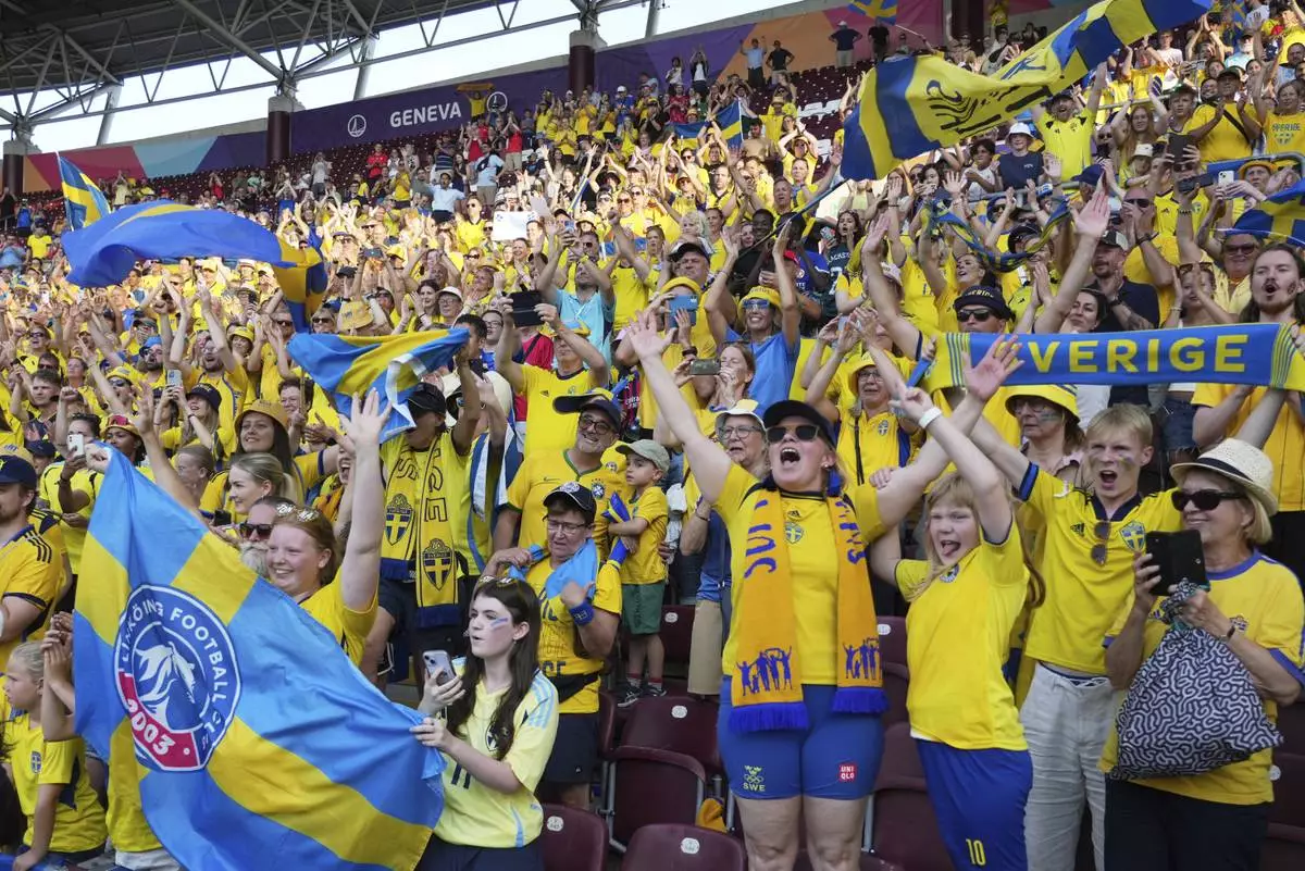 Sweden's fans celebrate after the Euro 2025, group C, soccer match between Denmark and Sweden at Stade de Geneve in Geneva, Switzerland, Friday, July 4, 2025. (AP Photo/Alessandra Tarantino)