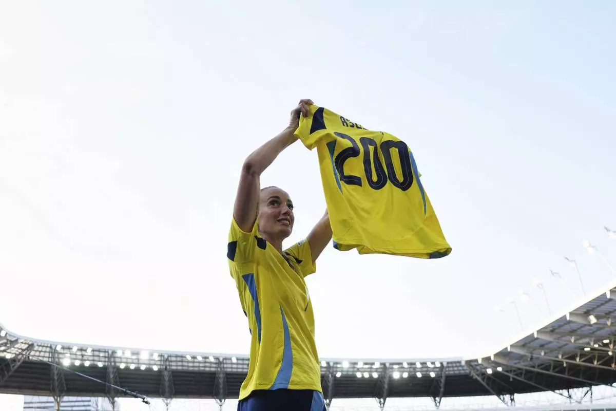 Sweden's Kosovare Asllani celebrates her 200th appearance in Sweden's national team after the Euro 2025, group C, soccer match between Denmark and Sweden at Stade de Geneve in Geneva, Switzerland, Friday, July 4, 2025. (AP Photo/Alessandra Tarantino)
