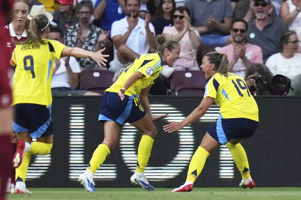 Sweden's Filippa Angeldahl celebrates with teammate Johanna Rytting Kaneryd, right, after scoring the opening goal during the Euro 2025, group C, soccer match between Denmark and Sweden at Stade de Geneve in Geneva, Switzerland, Friday, July 4, 2025. (AP Photo/Alessandra Tarantino)
