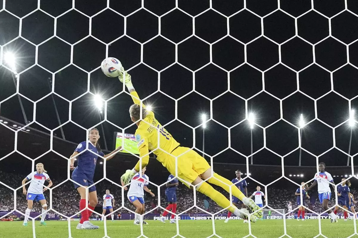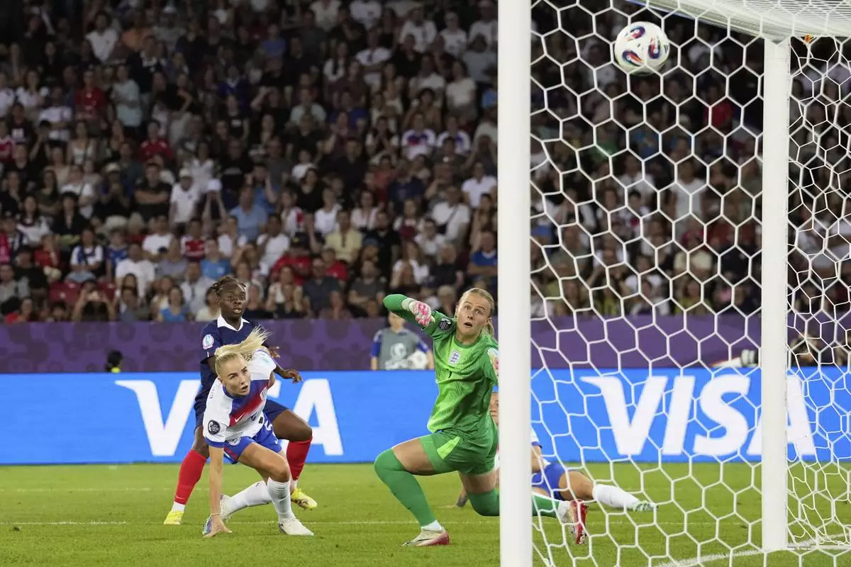 France goalkeeper Pauline Peyraud-Magnin touches the ball but fails to stop a goal by England's Keira Walsh during the Euro 2025, group D, soccer match between France and England at Stadion Letzigrund in Zurich, Switzerland, Saturday, July 5, 2025. (AP Photo/Martin Meissner)