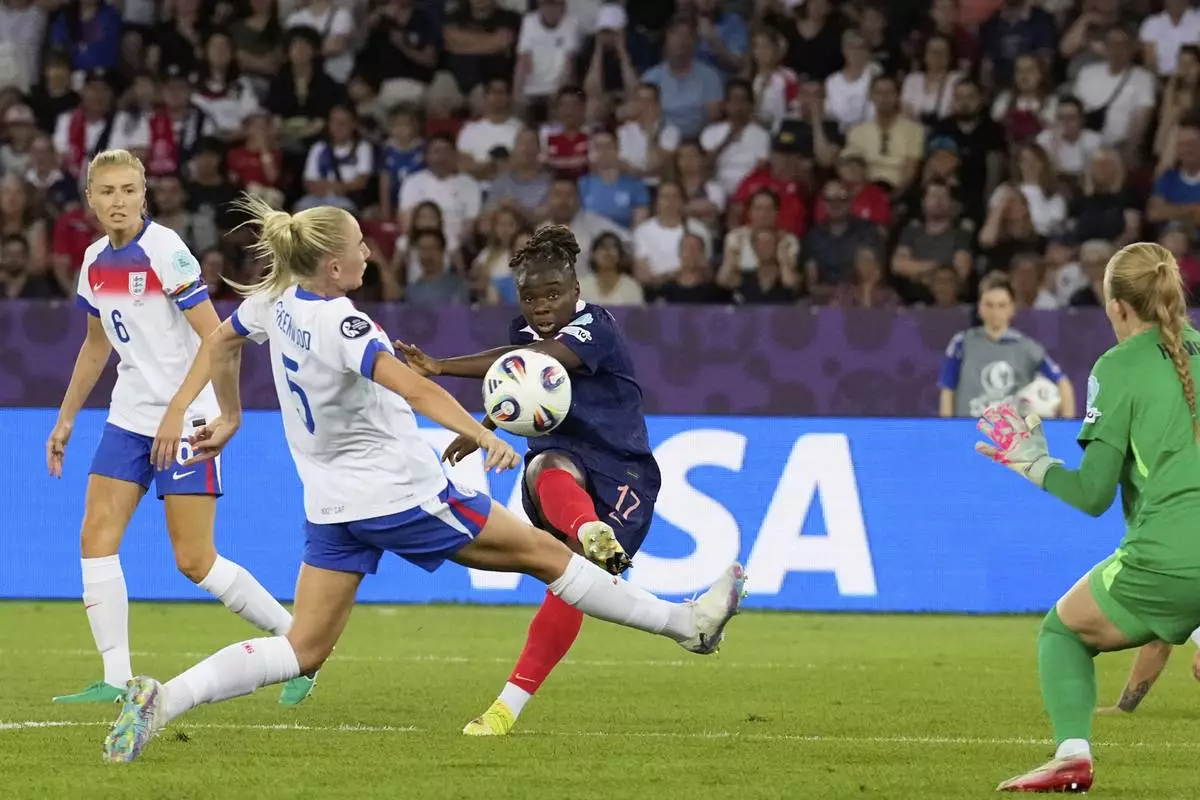France's Sandy Baltimore, background, scores her side's second goal during the Euro 2025, group D, soccer match between France and England at Stadion Letzigrund in Zurich, Switzerland, Saturday, July 5, 2025. (AP Photo/Martin Meissner)