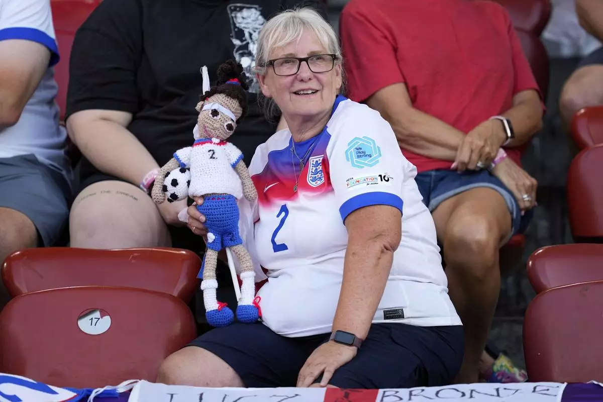 A fan of England's Lucy Bronze holds a doll with her number 2 shirt on the stands before the Euro 2025, group D, soccer match between France and England at Stadion Letzigrund in Zurich, Switzerland, Saturday, July 5, 2025. (AP Photo/Martin Meissner)