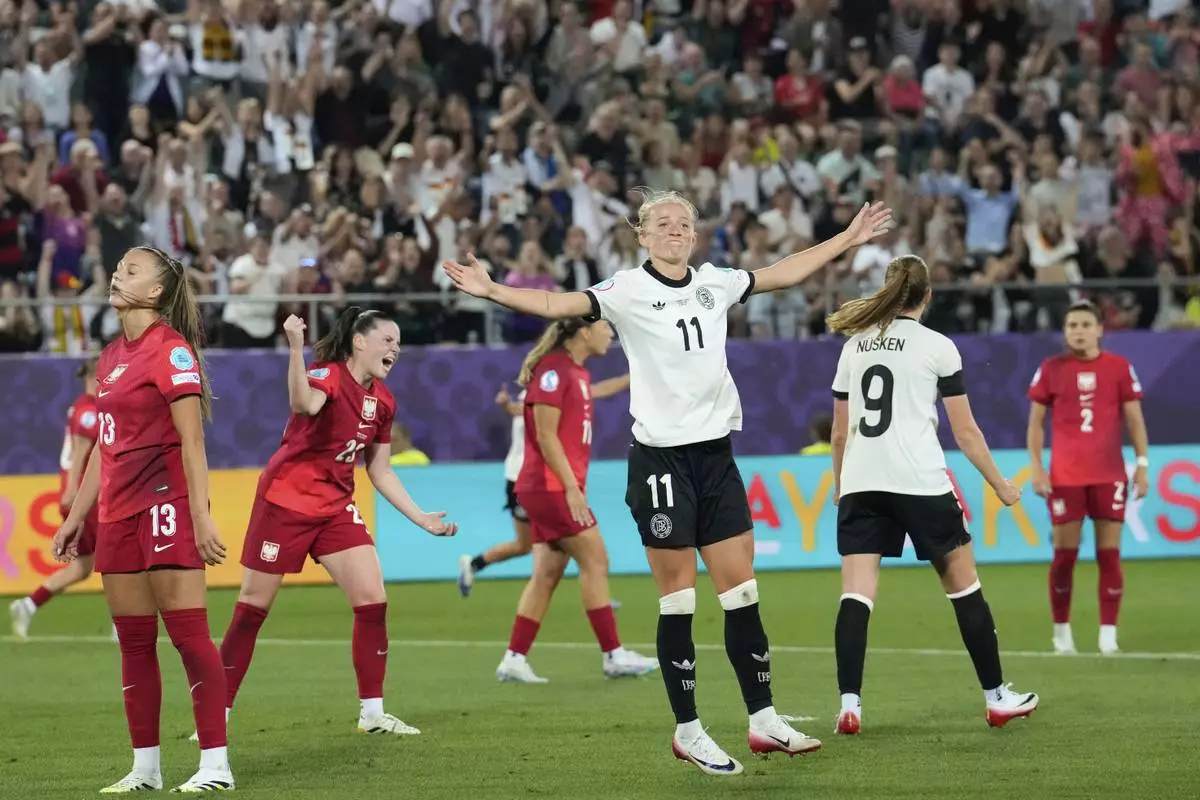 Germany's Lea Schueller celebrates after scoring her side's second goal during the Euro 2025, group C, soccer match between Germany and Poland at Arena St. Gallen in St. Gallen, Switzerland, Friday, July 4, 2025. (AP Photo/Martin Meissner)