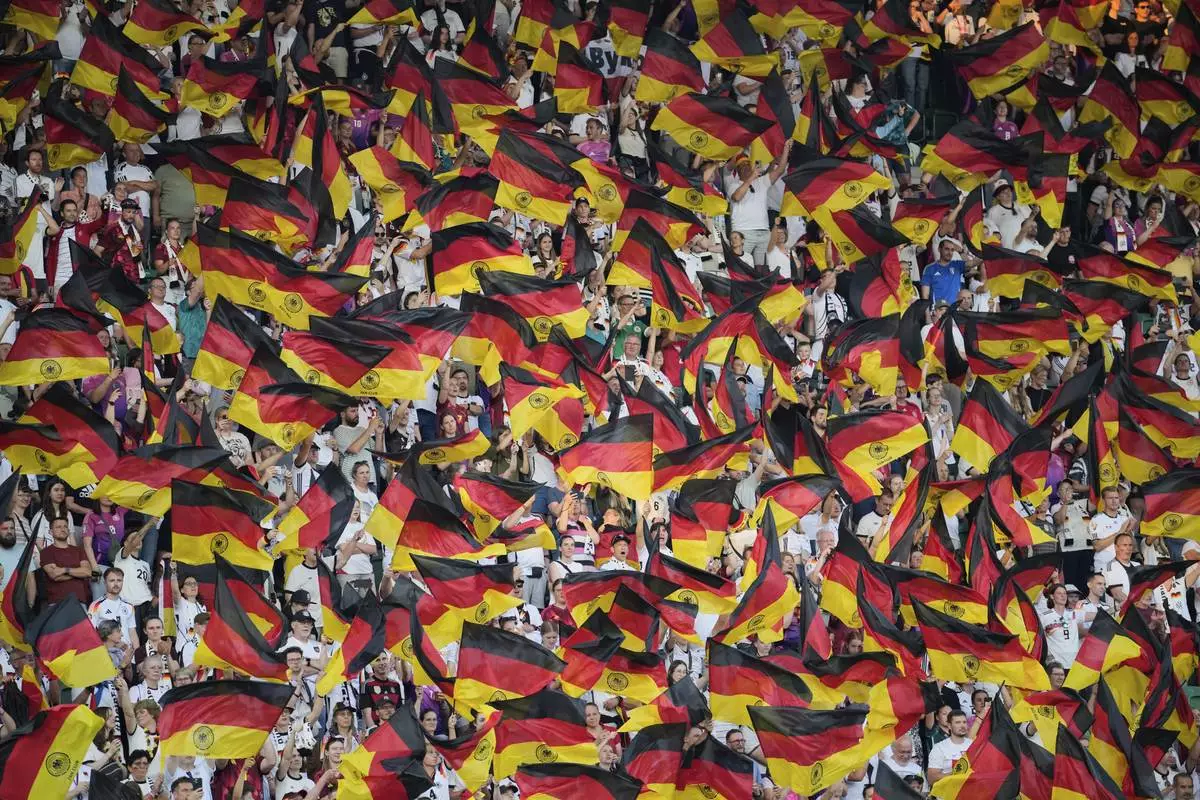 German supporters wave flags on the stands during the Euro 2025, group C, soccer match between Germany and Poland at Arena St. Gallen in St. Gallen, Switzerland, Friday, July 4, 2025. (AP Photo/Martin Meissner)