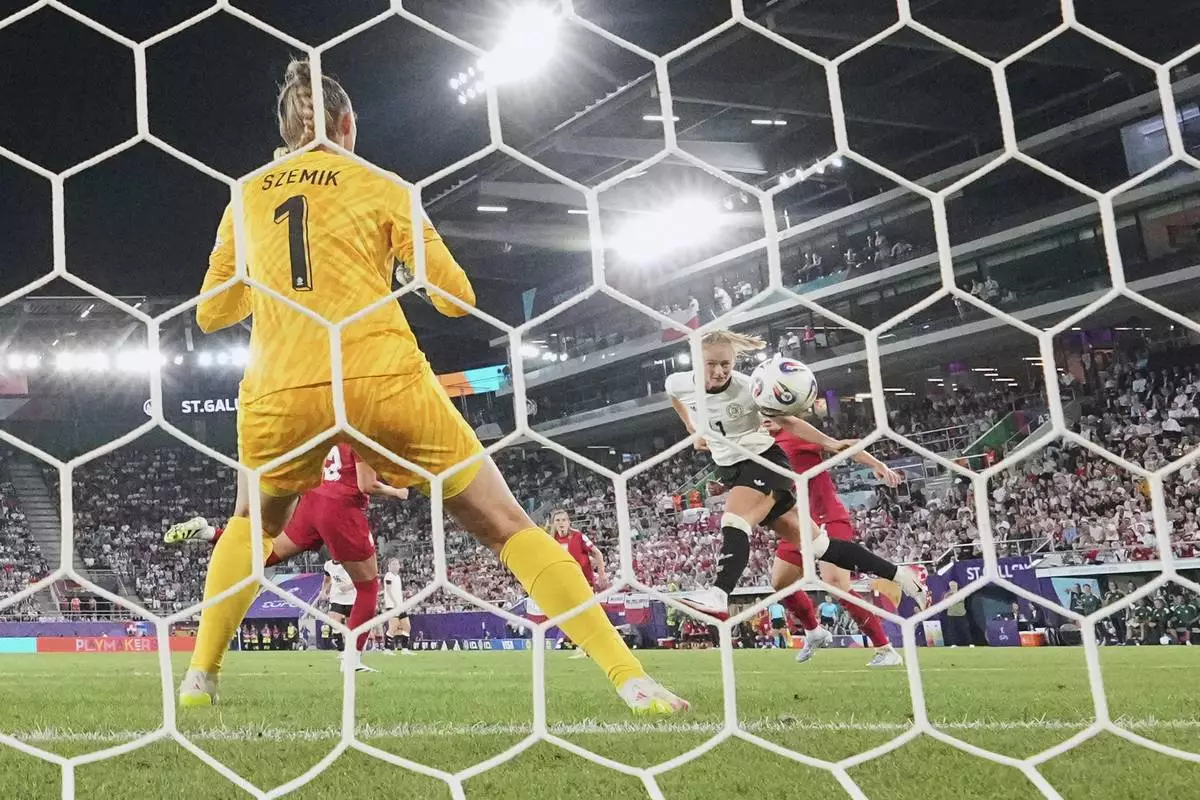 Germany's Lea Schueller, right, scores her side's second goal past Poland goalkeeper Kinga Szemik during the Euro 2025, group C, soccer match between Germany and Poland at Arena St. Gallen in St. Gallen, Switzerland, Friday, July 4, 2025. (AP Photo/Martin Meissner)
