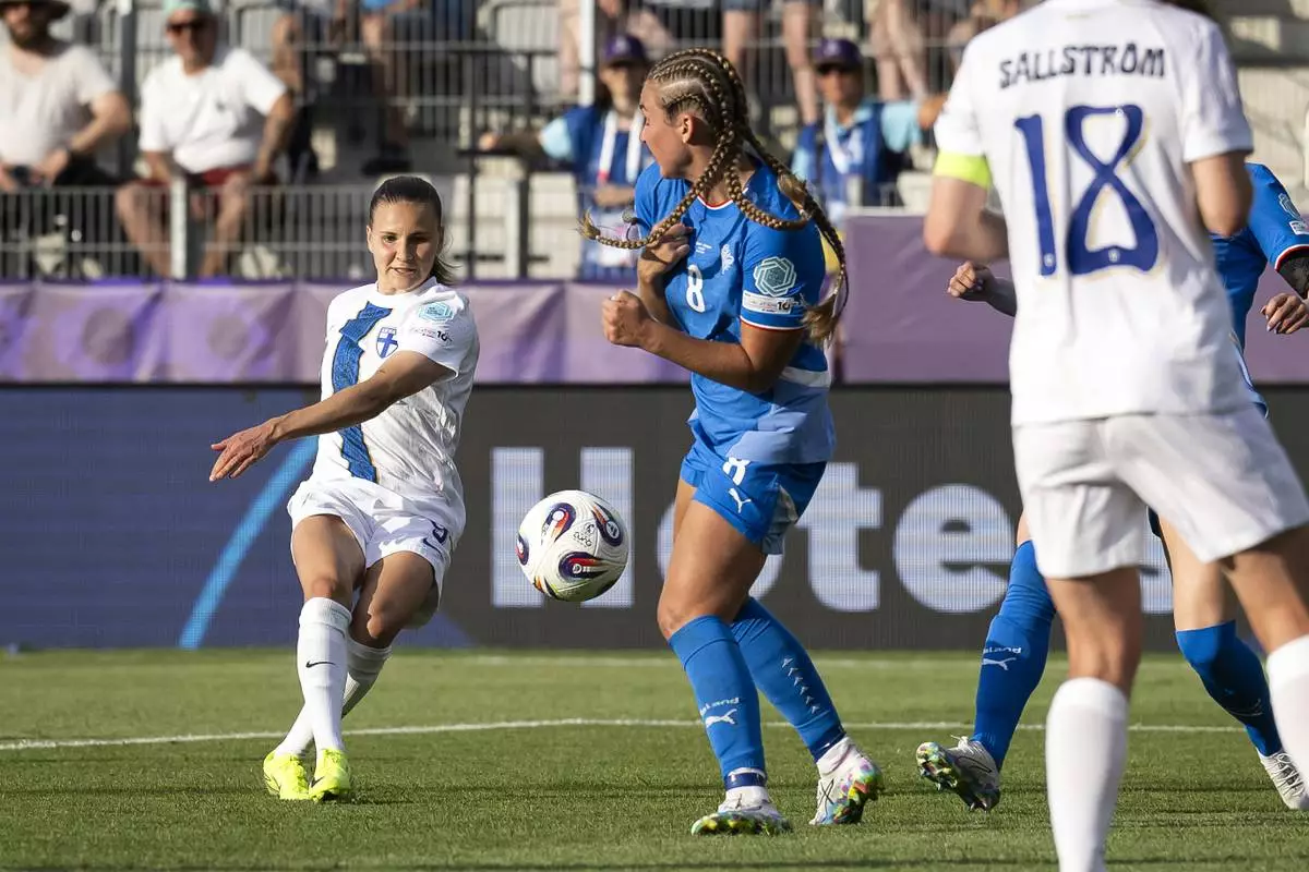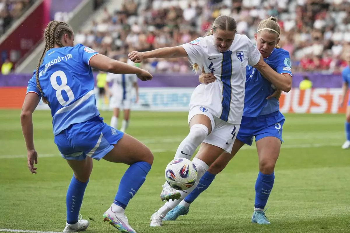 Finland 's Ria Oling, center, challenges for the ball with Iceland's Saedis Heioarsdottir during the Euro 2025, group A, soccer match between Iceland and Finland at Arena Thun in Thun, Switzerland, Wednesday, July 2, 2025. (AP Photo/Alessandra Tarantino)