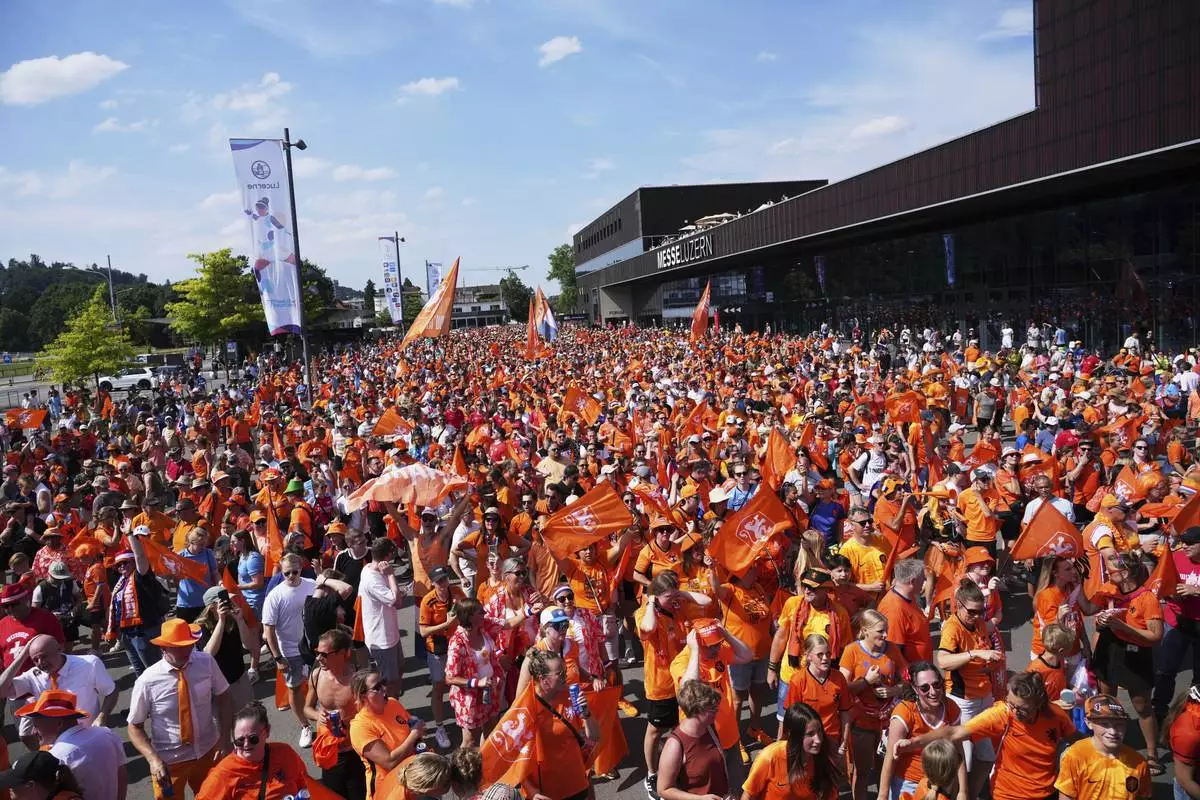 Netherlands supporters head to the stadium for the Euro 2025, group D, soccer match between Wales and the Netherlands at Allmend Stadion Luzern in Lucerne, Switzerland, Saturday, July 5, 2025. (AP Photo/Alessandra Tarantino)