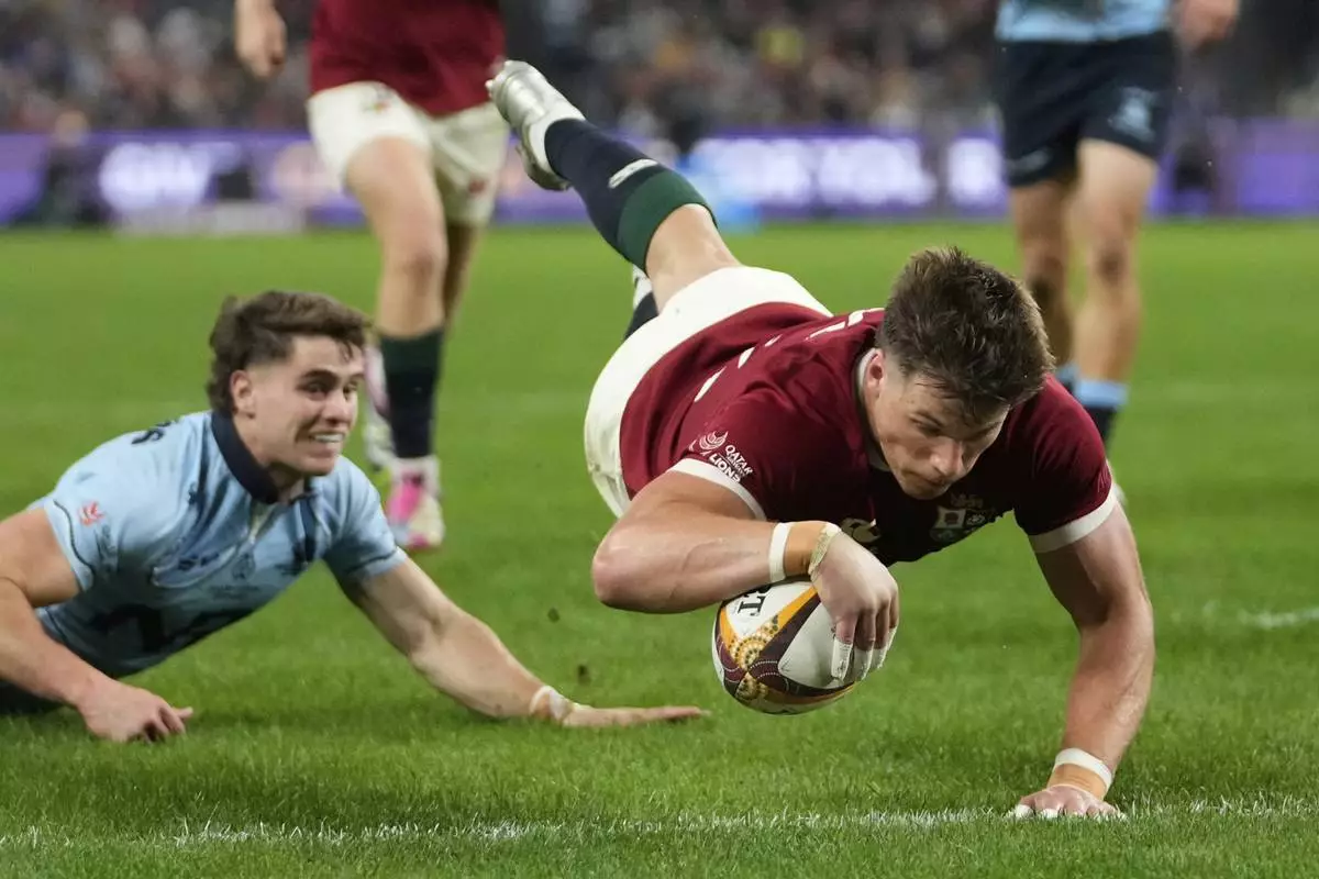 Huw Jones of the British & Irish Lions scores a try during the Lions and Waratahs rugby match, in Sydney, Australia, Saturday, July 5, 2025. (AP Photo/Rick Rycroft)