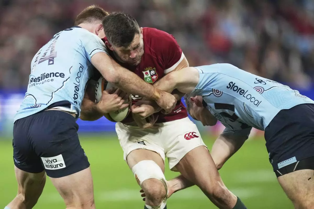 Blair Kinghorn of the British & Irish Lions is tackled by defenders during the Lions and Waratahs rugby match in Sydney, Australia, Saturday, July 5, 2025. (AP Photo/Mark Baker)