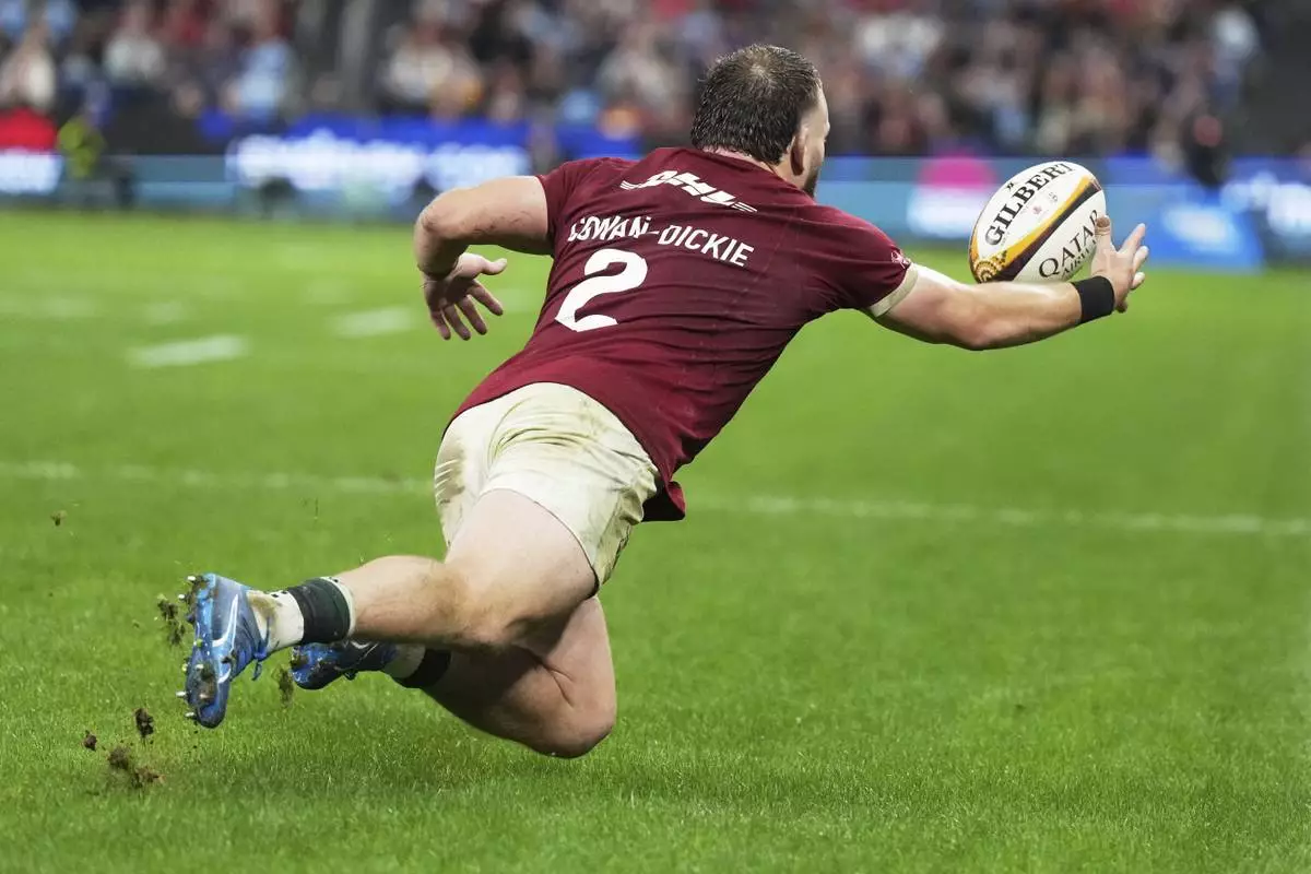 Luke Cowan-Dickie of the British & Irish Lions reaches out to catch the ball during the Lions and Waratahs rugby match in Sydney, Australia, Saturday, July 5, 2025. (AP Photo/Mark Baker)