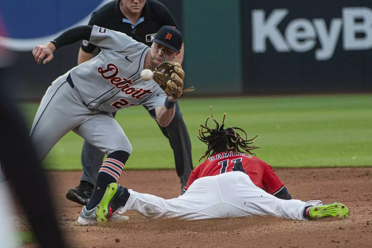 Detroit Tigers' Trey Sweeney waits for the throw as Cleveland Guardians' Jose Ramirez steals second base during the fourth inning of a baseball game, Saturday, July 5, 2025, in Cleveland. (AP Photo/Phil Long)
