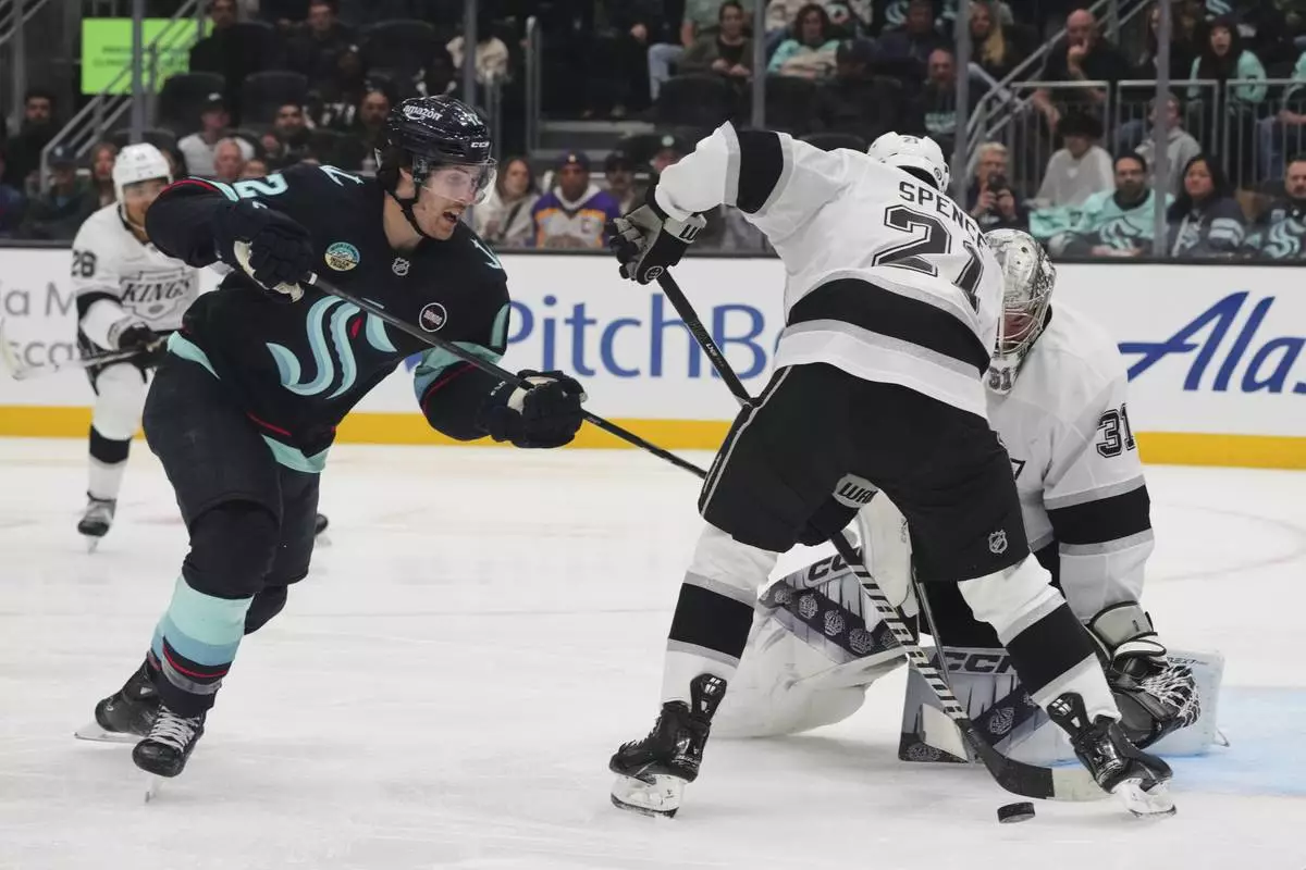 FILE - Los Angeles Kings goaltender David Rittich (31) and defenseman Jordan Spence (21) block the puck against Seattle Kraken left wing Tye Kartye, left, during the second period of an NHL hockey game, April 15, 2025, in Seattle. (AP Photo/Lindsey Wasson, File)