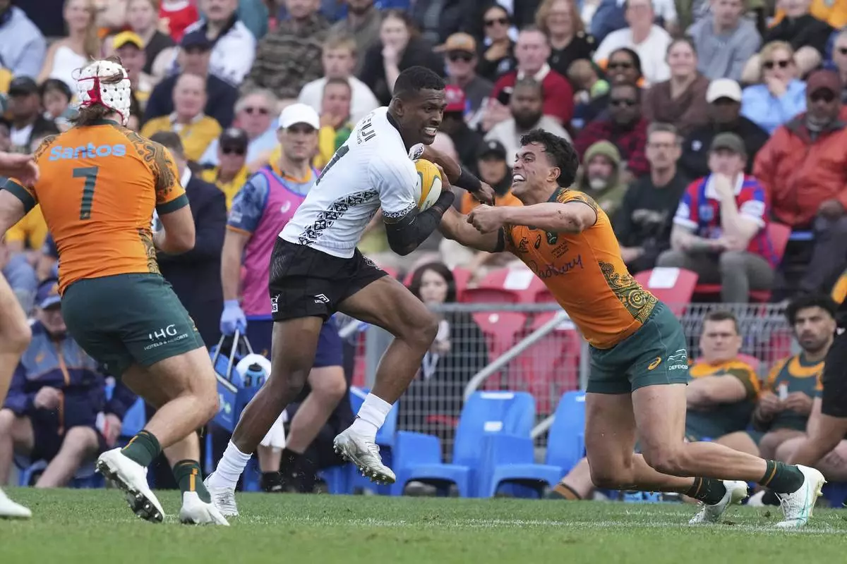 Fiji's Jiuta Wainiqolo, center, breaks through the Australian defense during their rugby union international match in Newcastle, Australia, Sunday, July 6, 2025. (AP Photo/Mark Baker)