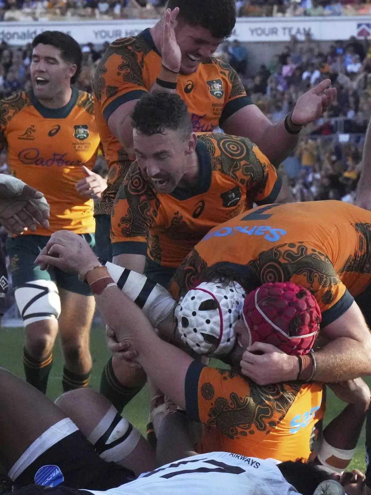 Australia's Harry Wilson, wearing a red helmet, celebrates with teammates after scoring a try against Fiji during their rugby union international match in Newcastle, Australia, Sunday, July 6, 2025. (AP Photo/Mark Baker)