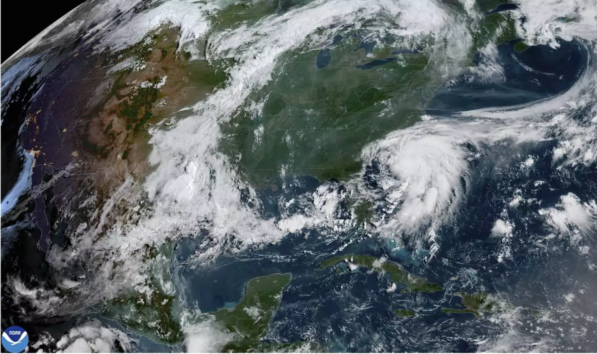 This image provided by NOAA shows Tropical Storm Chantal forming off the coast of the Carolinas on Saturday, July 5, 2025. (NOAA via AP