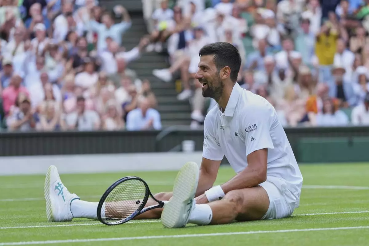 Novak Djokovic of Serbia sits on the grass after diving to return to Miomir Kecmanovic of Serbia during a third round men's singles match at the Wimbledon Tennis Championships in London, Saturday, July 5, 2025. (AP Photo/Kirsty Wigglesworth)