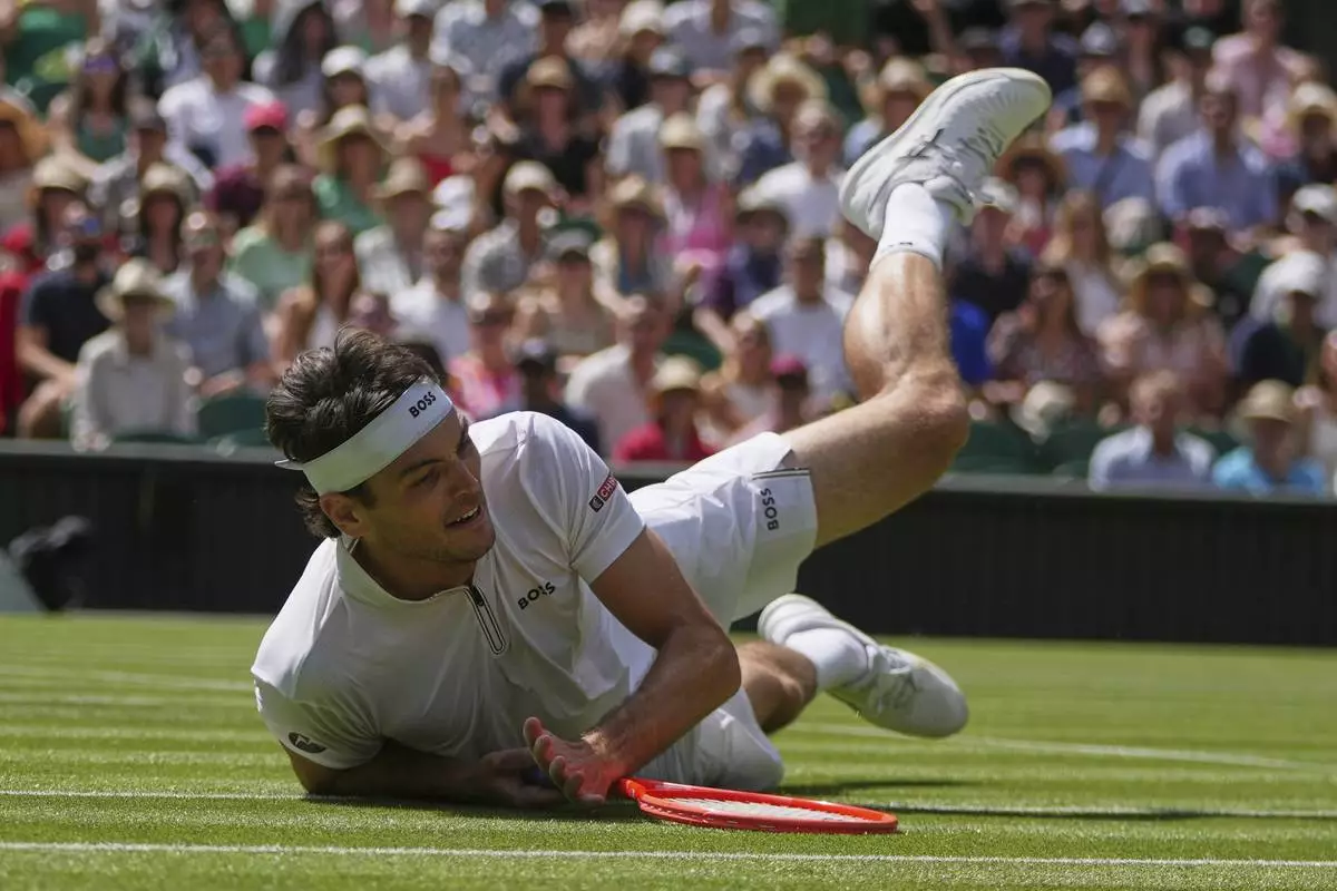 Taylor Fritz of the U.S. falls to the court after diving to return to Alejandro Davidovich Fokina of Spain during a third round singles match at the Wimbledon Tennis Championships in London, Friday, July 4, 2025. (AP Photo/Kin Cheung)