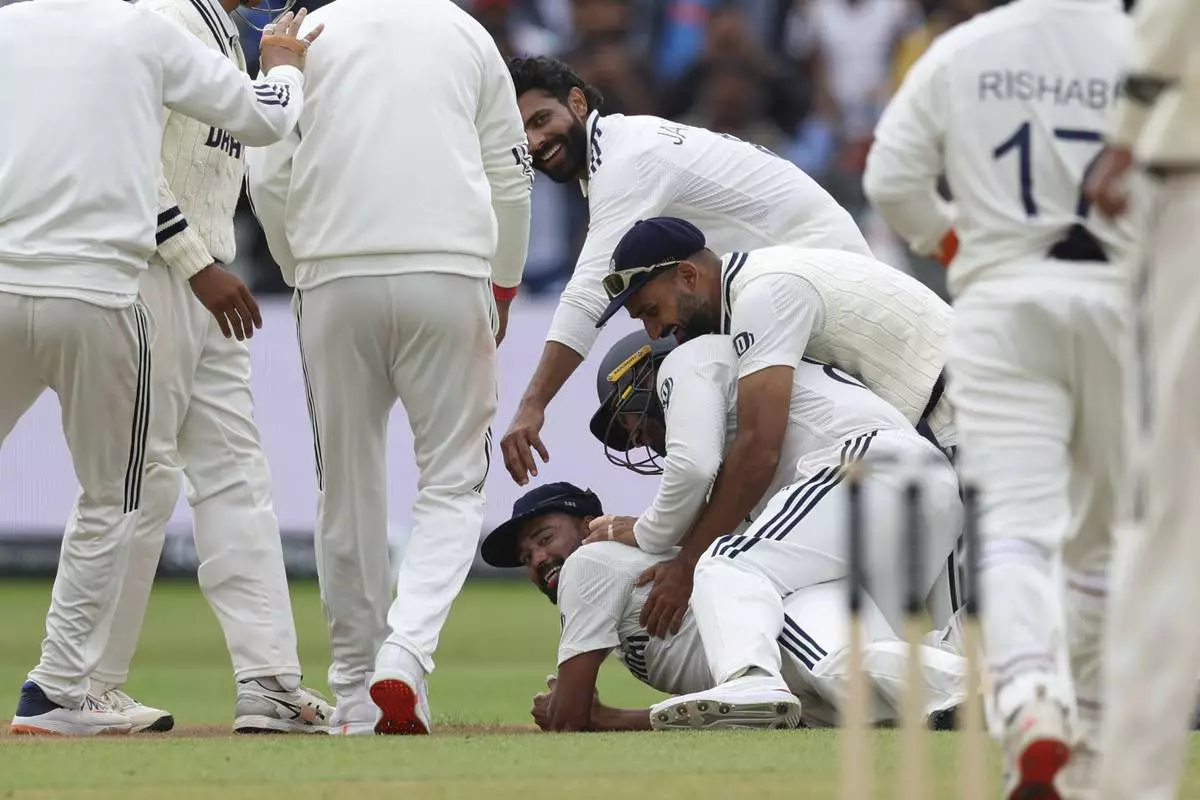 India's Mohammed Siraj, on ground, celebrates with teammates after taking the catch to dismiss England's Josh Tongue on day five of the second cricket test match between England and India at Edgbaston in Birmingham, England, Sunday, July 6, 2025. (AP Photo/Scott Heppell)