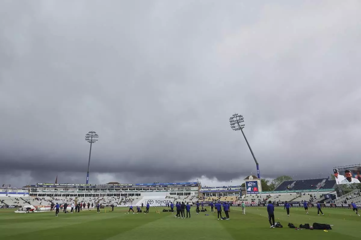 Dark clouds loom over Edgbaston cricket ground as players train before the start of play on day five of the second cricket test match between England and India in Birmingham, England, Sunday, July 6, 2025. (AP Photo/Scott Heppell)