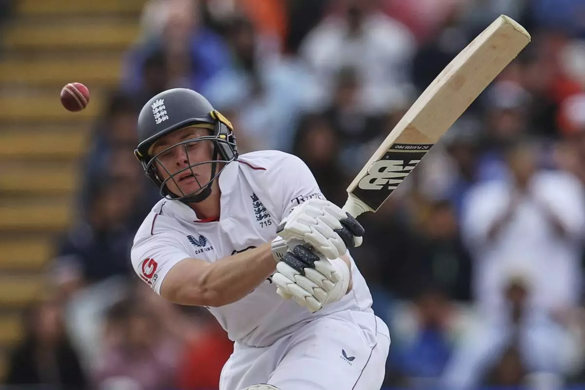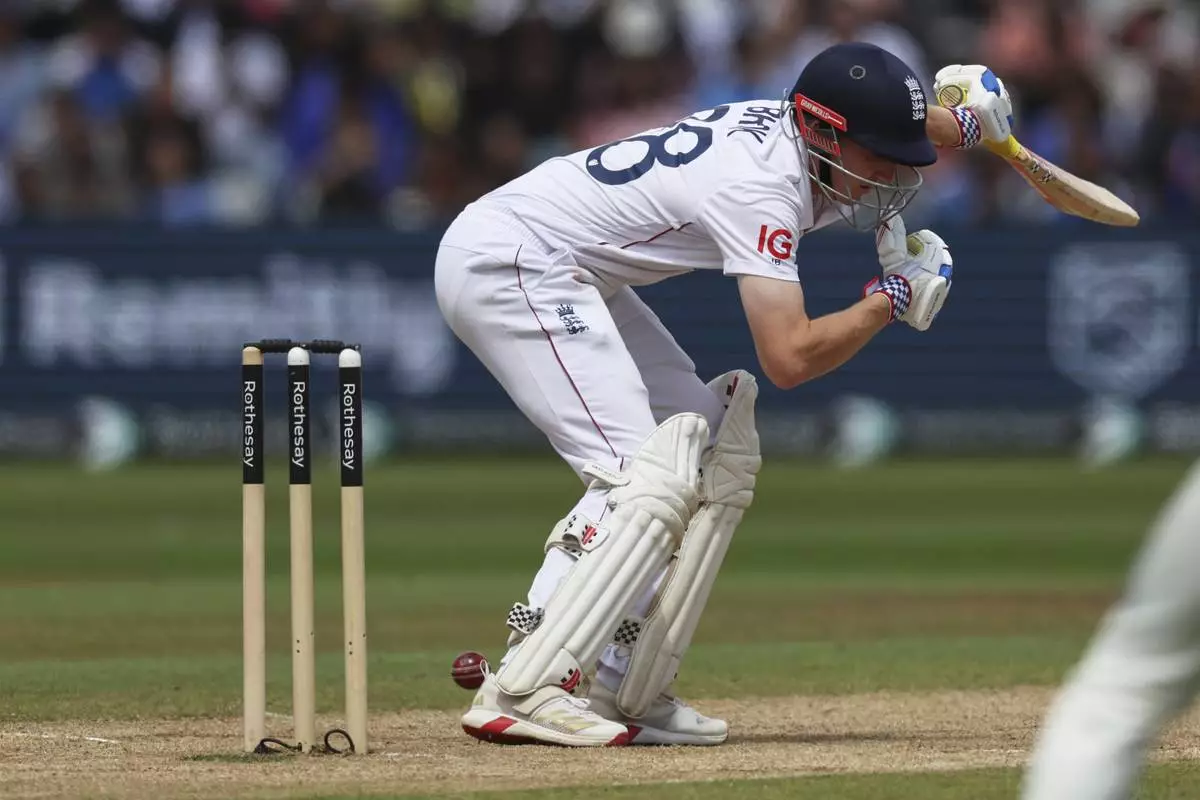 England's Harry Brook is dismissed LBW by India's Akash Deep on day five of the second cricket test match between England and India at Edgbaston in Birmingham, England, Sunday, July 6, 2025. (AP Photo/Scott Heppell)