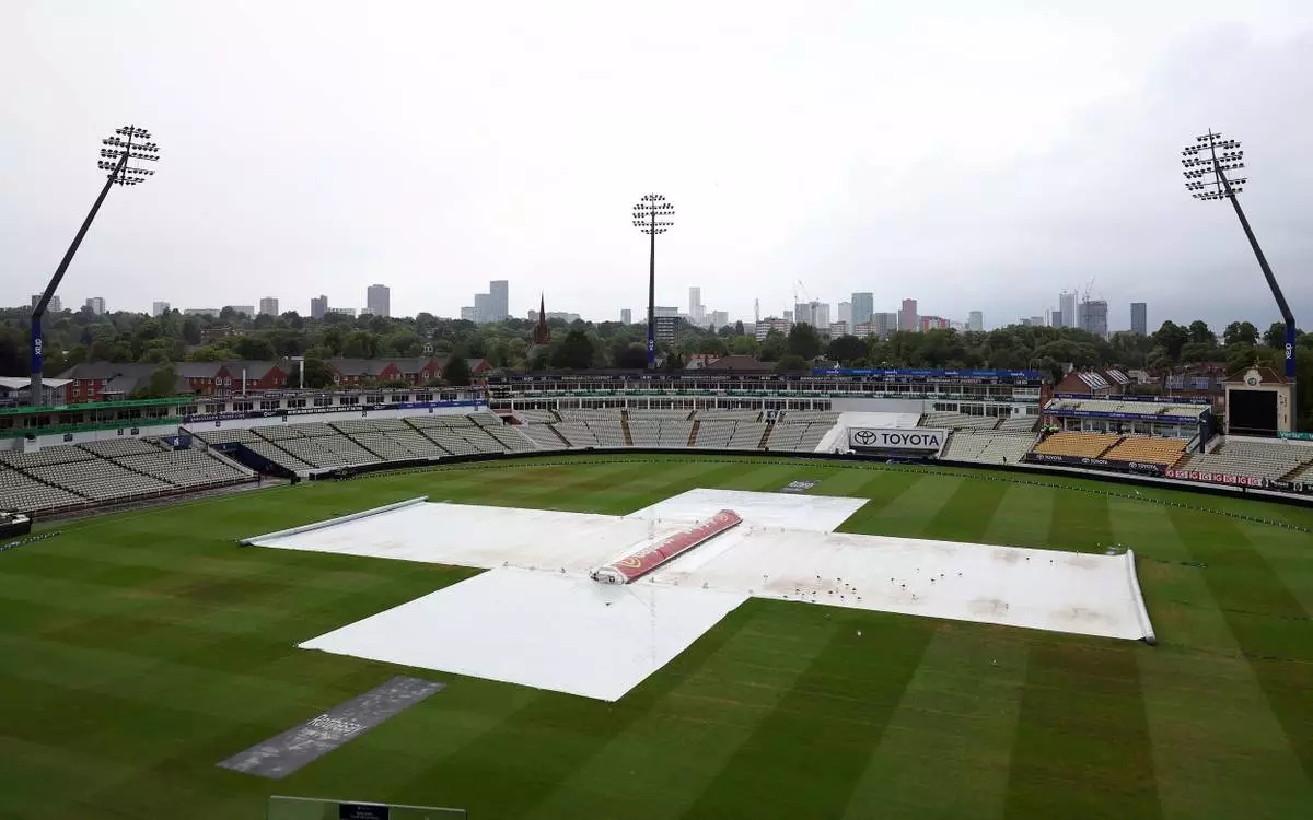 A general view of the field of play with the rain covers on due to the rain ahead of day five of the second cricket test match between England and India at Edgbaston in Birmingham, England, Sunday, July 6, 2025. (AP Photo/Scott Heppell)