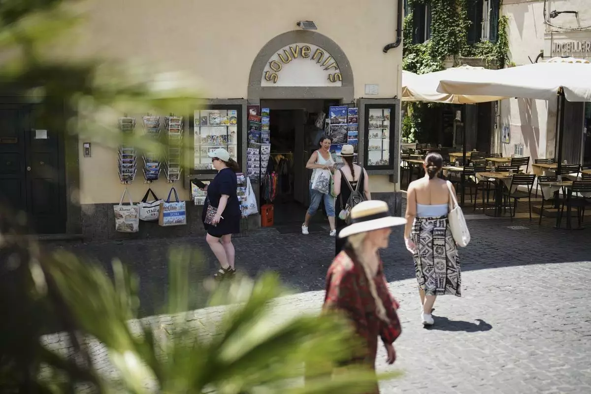 People walk past a souvenir shop in the town of Castel Gandolfo, a historic summer retreat for popes about 30 kilometers southeast of Rome, where Pope Leo XIV will be spending a short period of rest, is seen Wednesday, July 2, 2025. (AP Photo/Andrew Medichini)