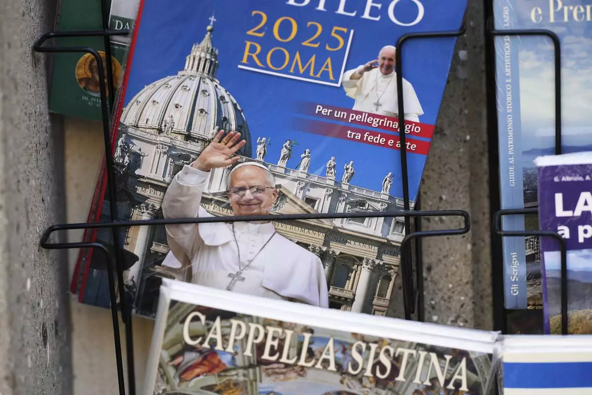 A guide book with an image of Pope Leo XIV on its cover is on display outside a souvenir shop in the town of Castel Gandolfo, a historic summer retreat for popes about 30 kilometers southeast of Rome, where Pope Leo XIV will be spending a short period of rest, is seen Wednesday, July 2, 2025. (AP Photo/Andrew Medichini)