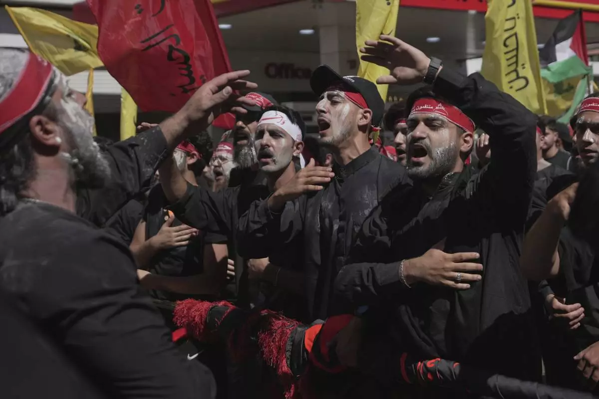 Hezbollah supporters beat their chests as they march during Ashoura, the Shiite Muslim commemoration marking the 7th-century death of Imam Hussein, the grandson of the Prophet Muhammad, at the Battle of Karbala, in the southern suburbs of Beirut, Lebanon, Sunday, July 6, 2025. (AP Photo/Hassan Ammar)