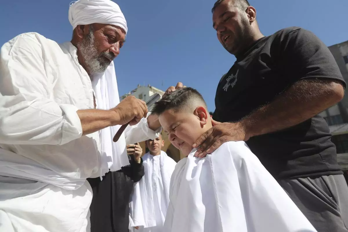 A Lebanese Shiite boy winces as a man prepares to cut his head with a razor during Ashoura, the Shiite Muslim commemoration marking the 7th-century death of Imam Hussein, the grandson of the Prophet Muhammad, at the Battle of Karbala, in the southern market town of Nabatiyeh, Lebanon, Sunday, July 6, 2025. (AP Photo/Mohammad Zaatari)