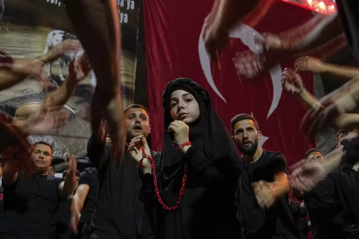 Shiite faithful Muslims attend an Ashoura procession in Istanbul, Turkey, Friday, July 4, 2025. Shiites mark Ashoura, the tenth day of the month of Muharram, to commemorate the Battle of Karbala when Imam Hussein, a grandson of Prophet Muhammad, was killed.(AP Photo/Khalil Hamra)