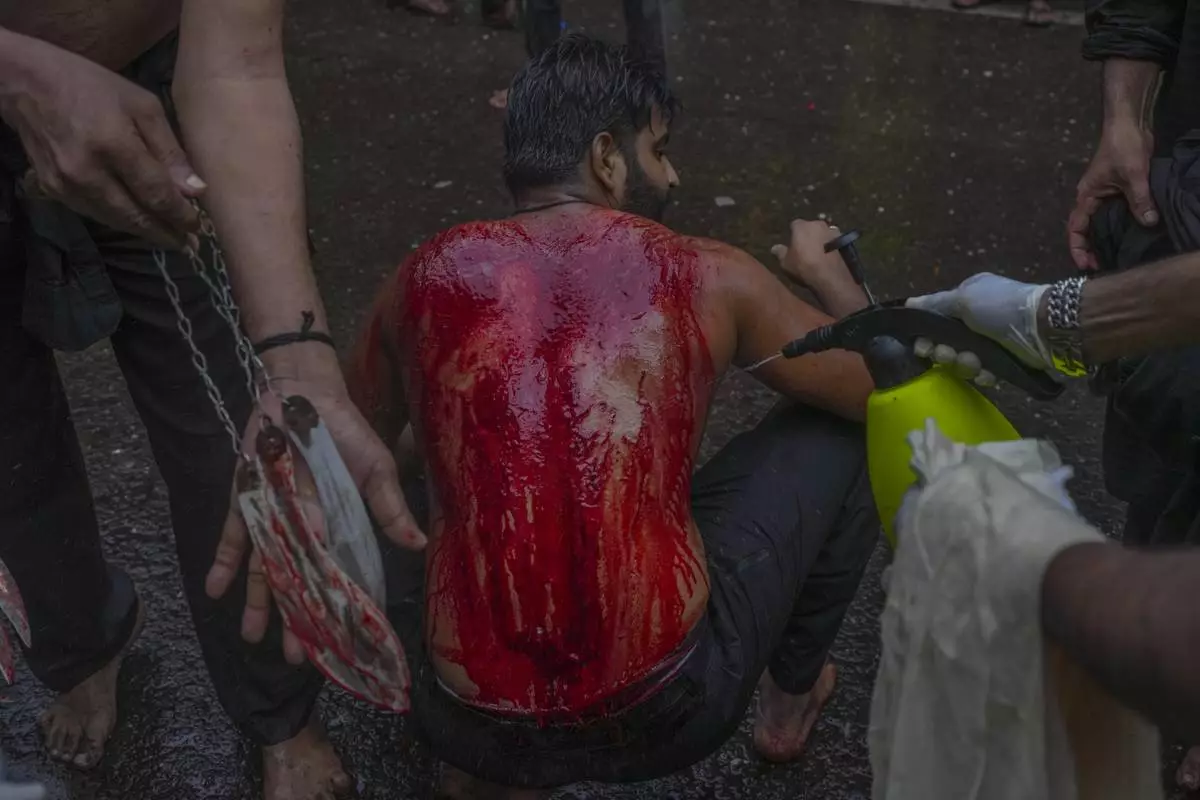 Shiite men bleed from self-inflicted wounds after cutting their heads with swords during a procession to mark the Muslim festival of Ashoura, on the 9th day of Muharram, in Baghdad, Saturday, July 5, 2025. (AP Photo/Hadi Mizban)