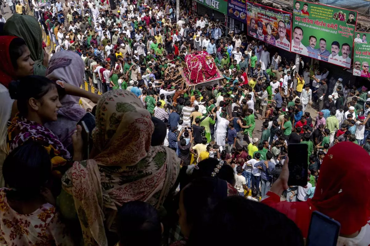 Muslim women and children stand on the roof of a hotel as they watch the Ashoura commemoration marking the 7th-century death of Imam Hussein, the grandson of the Prophet Muhammad, in Prayagraj, India, Sunday, July 6, 2025. (AP Photo/Rajesh Kumar Singh)