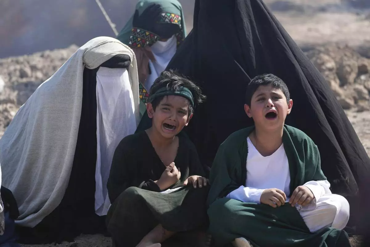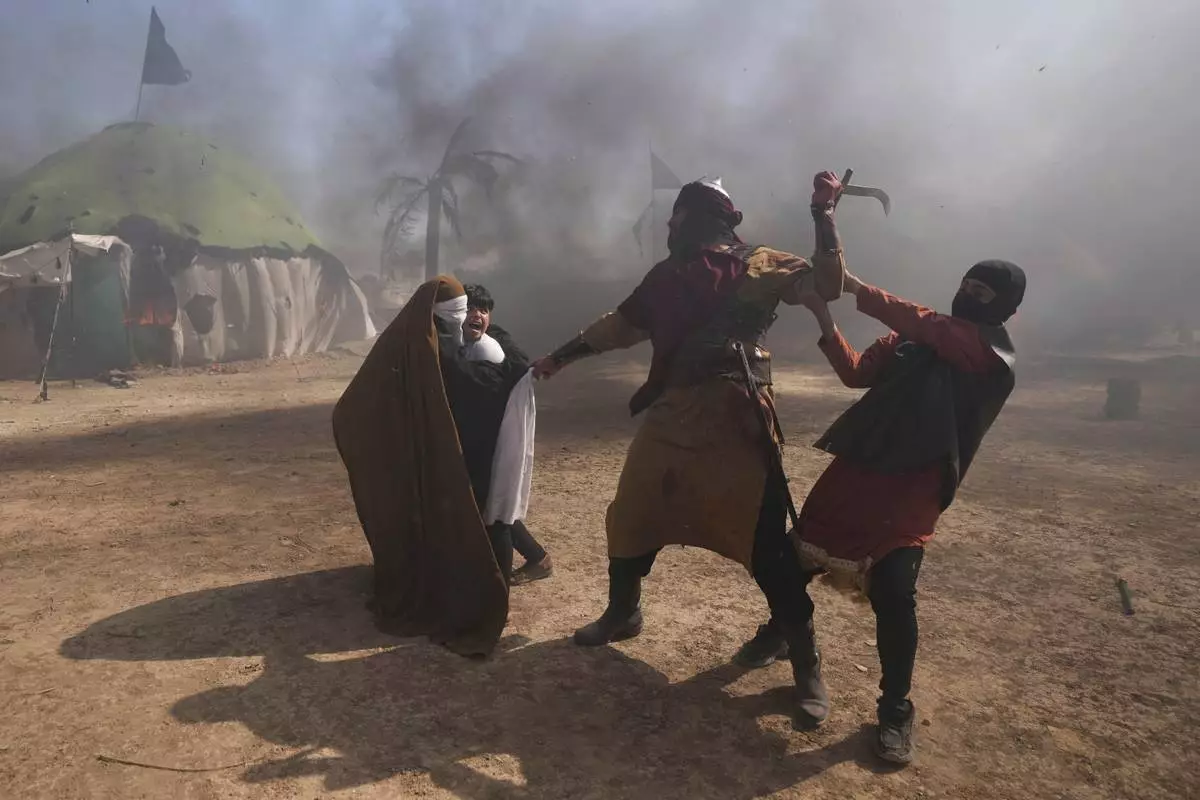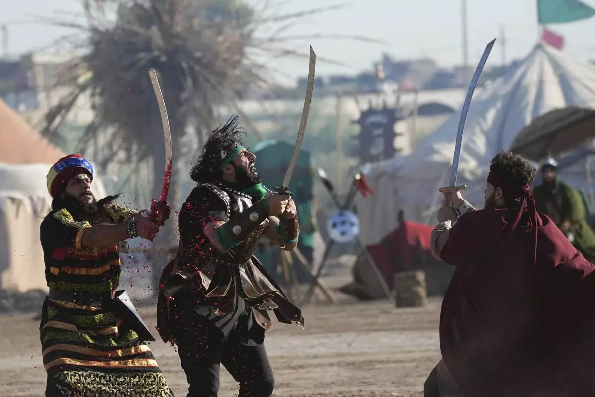 Shiite Muslims re-enact the seventh century battle of Karbala during activities marking the holy day of Ashoura, the annual Shiite Muslim commemoration marking the death of Imam Hussein, the grandson of the Prophet Muhammad, in the Shiite neighborhood of Sadr City, Baghdad, Iraq, Sunday, July 6, 2025. (AP Photo/Hadi Mizban)