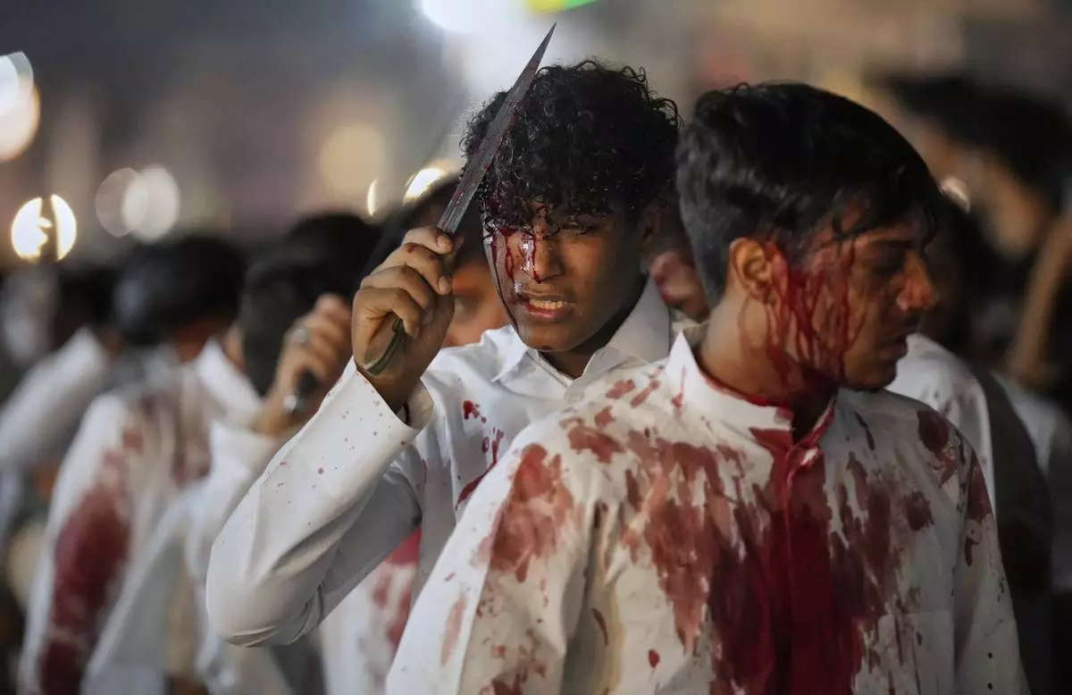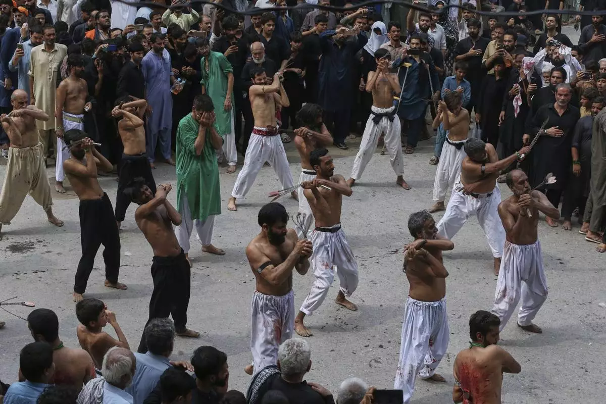 Shiite Muslim flagellate themselves in a ritual during an Ashoura procession, in Peshawar, Pakistan, Sunday, July 6, 2025. (AP Photo/Muhammad Sajjad)