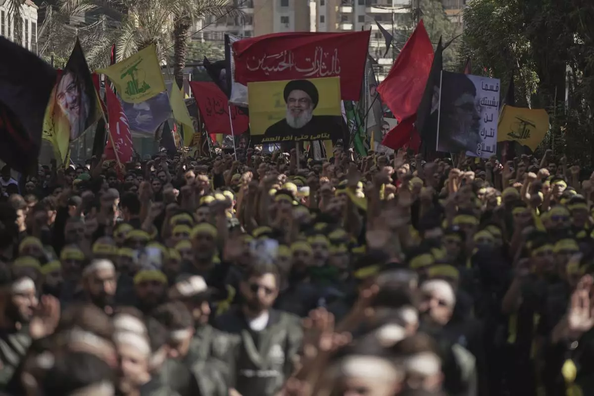 Hezbollah supporters raise their hands and beat their chests as they march during Ashoura, the Shiite Muslim commemoration marking the 7th-century death of Imam Hussein, the grandson of the Prophet Muhammad, at the Battle of Karbala, in the southern suburbs of Beirut, Lebanon, Sunday, July 6, 2025. (AP Photo/Hassan Ammar)