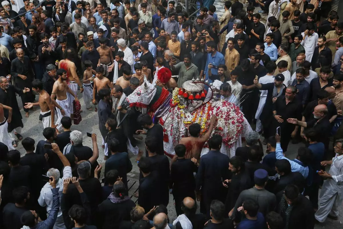 Shiite Muslims touch a horse, that symbolizes the horse that carried Imam Hussein during the battle of Karbala, at an Ashoura procession, in Peshawar, Pakistan, Sunday, July 6, 2025. (AP Photo/Muhammad Sajjad)