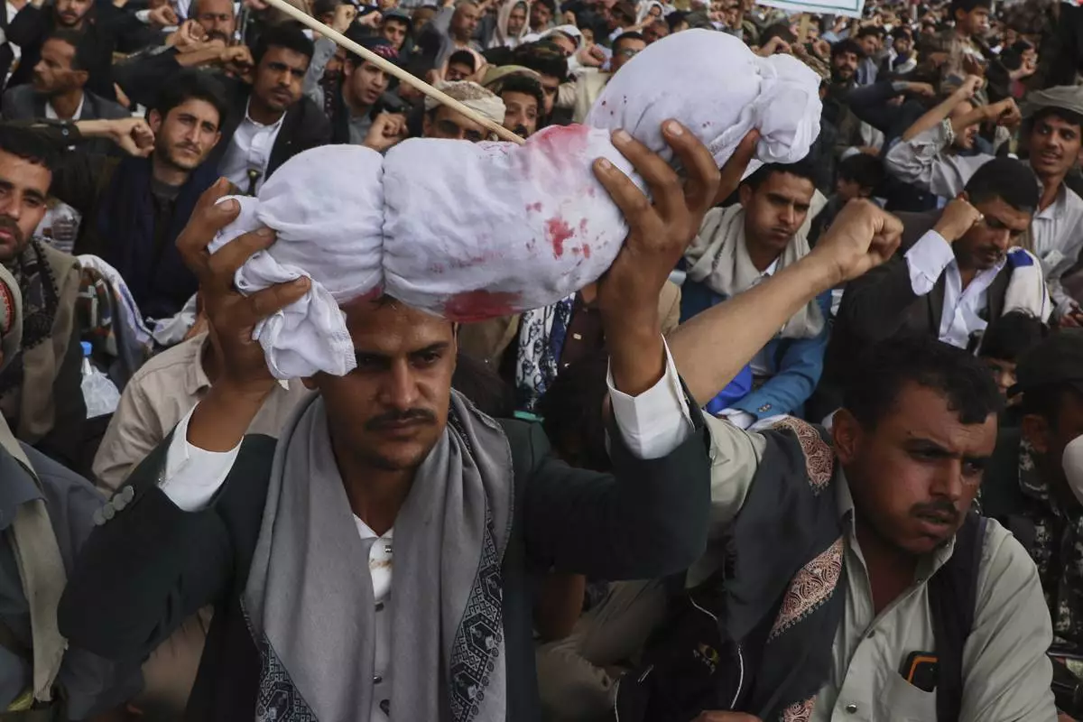 A Houthi supporter raises a symbolic bleeding coffin during Ashoura day, the Shiite Muslim commemoration marking the 7th-century death of Imam Hussein, the grandson of the Prophet Muhammad, in Sanaa, Yemen, Sunday, July 6, 2025. (AP Photo/Osamah Abdulrahman)
