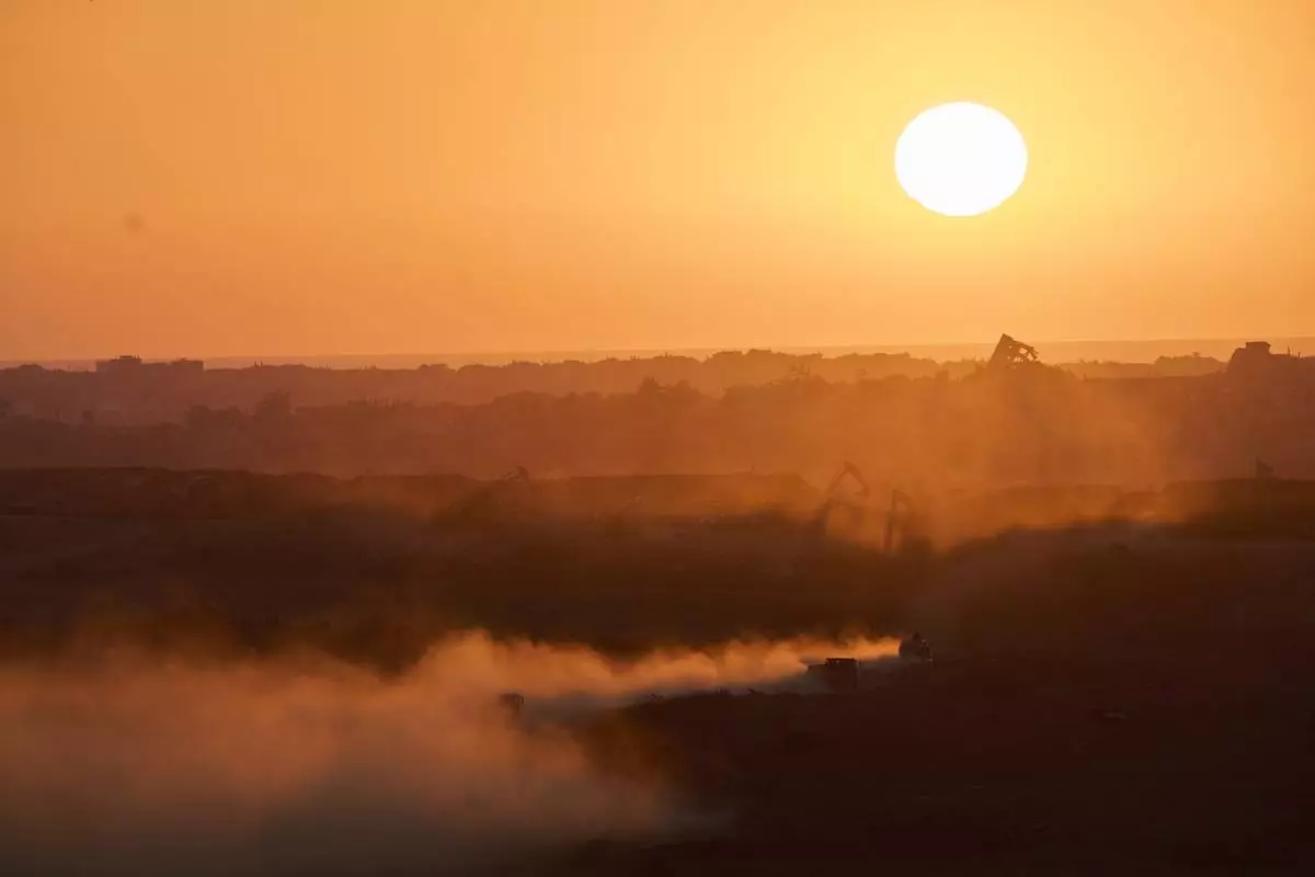 An Israeli army vehicle moves in the Gaza Strip as seen from southern Israel on Sunday, July 6, 2025. (Photo/Ohad Zwigenberg)