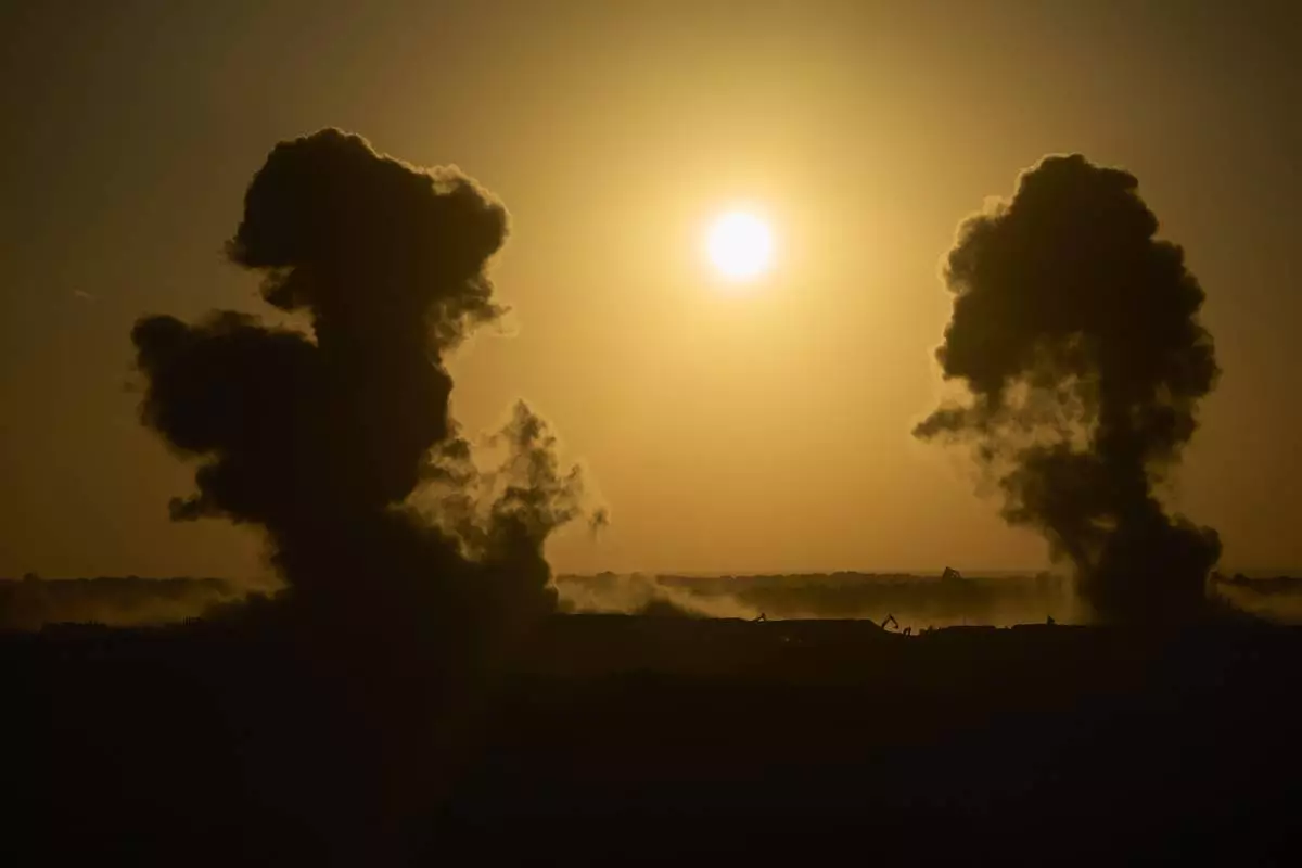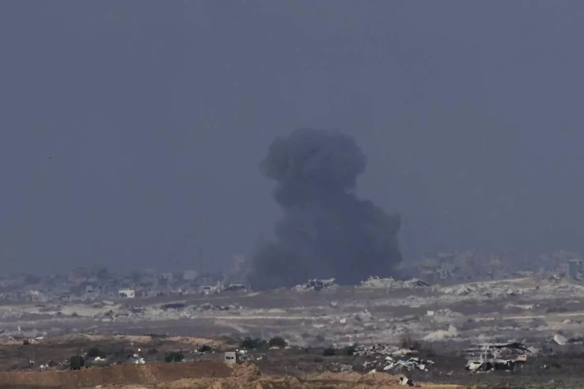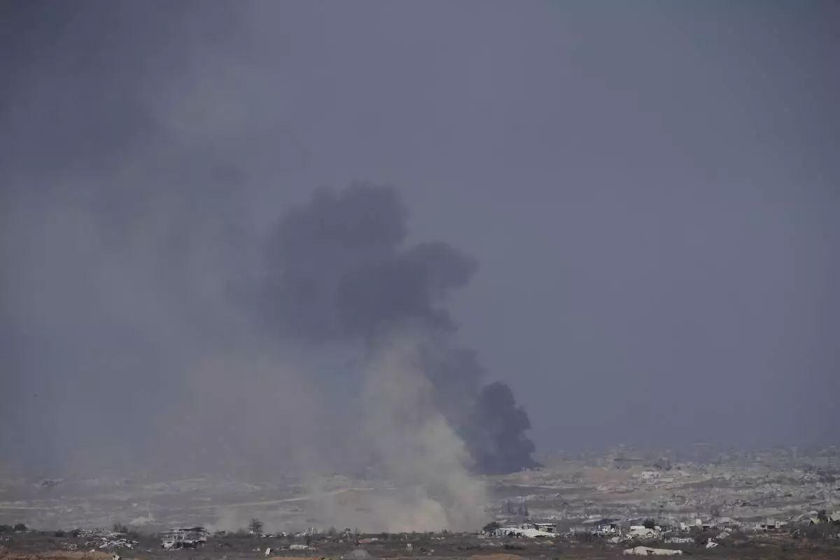 Smoke from an Israeli bombardment rises over the Gaza Strip, seen from southern Israel, Sunday, July 6, 2025. (AP Photo/Ohad Zwigenberg)