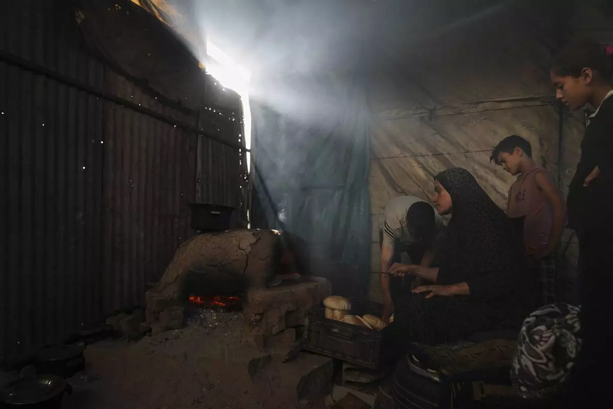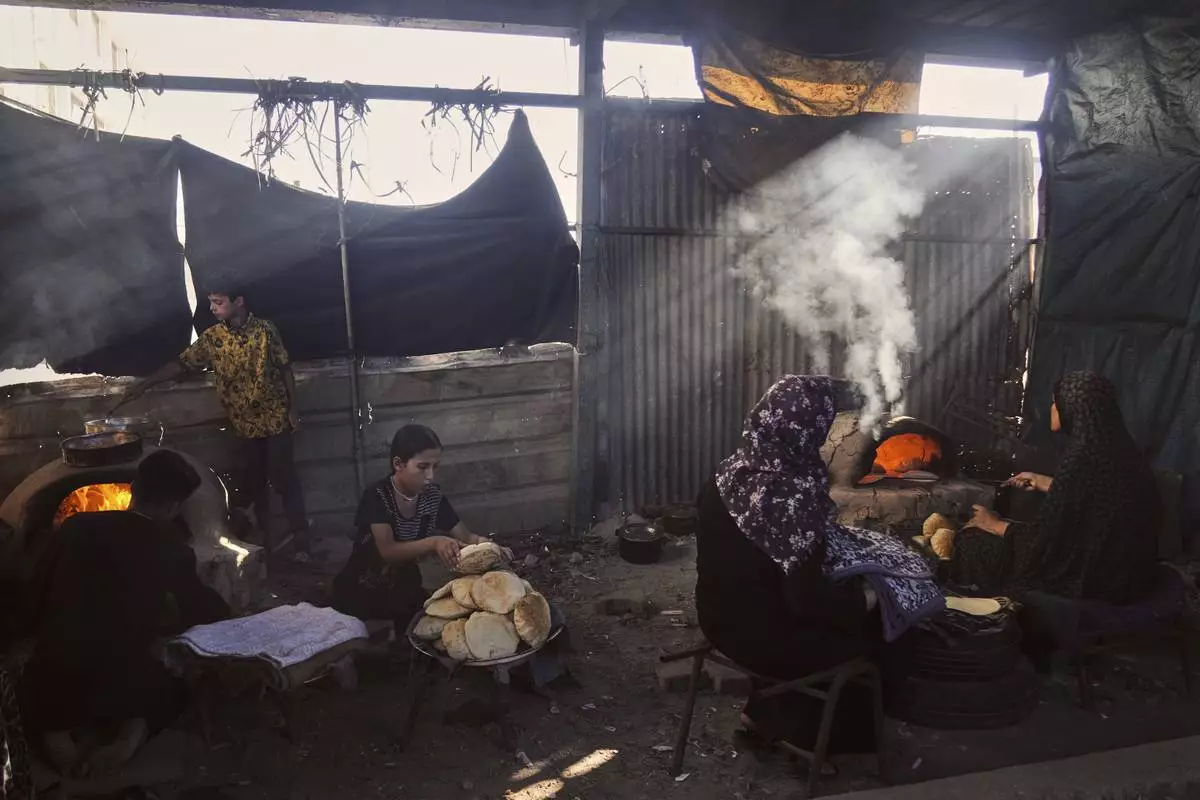 Displaced Palestinians bake bread in a school now serving as a shelter in Deir al-Balah, Gaza Strip Sunday, July 6, 2025. (AP Photo/Abdel Kareem Hana)