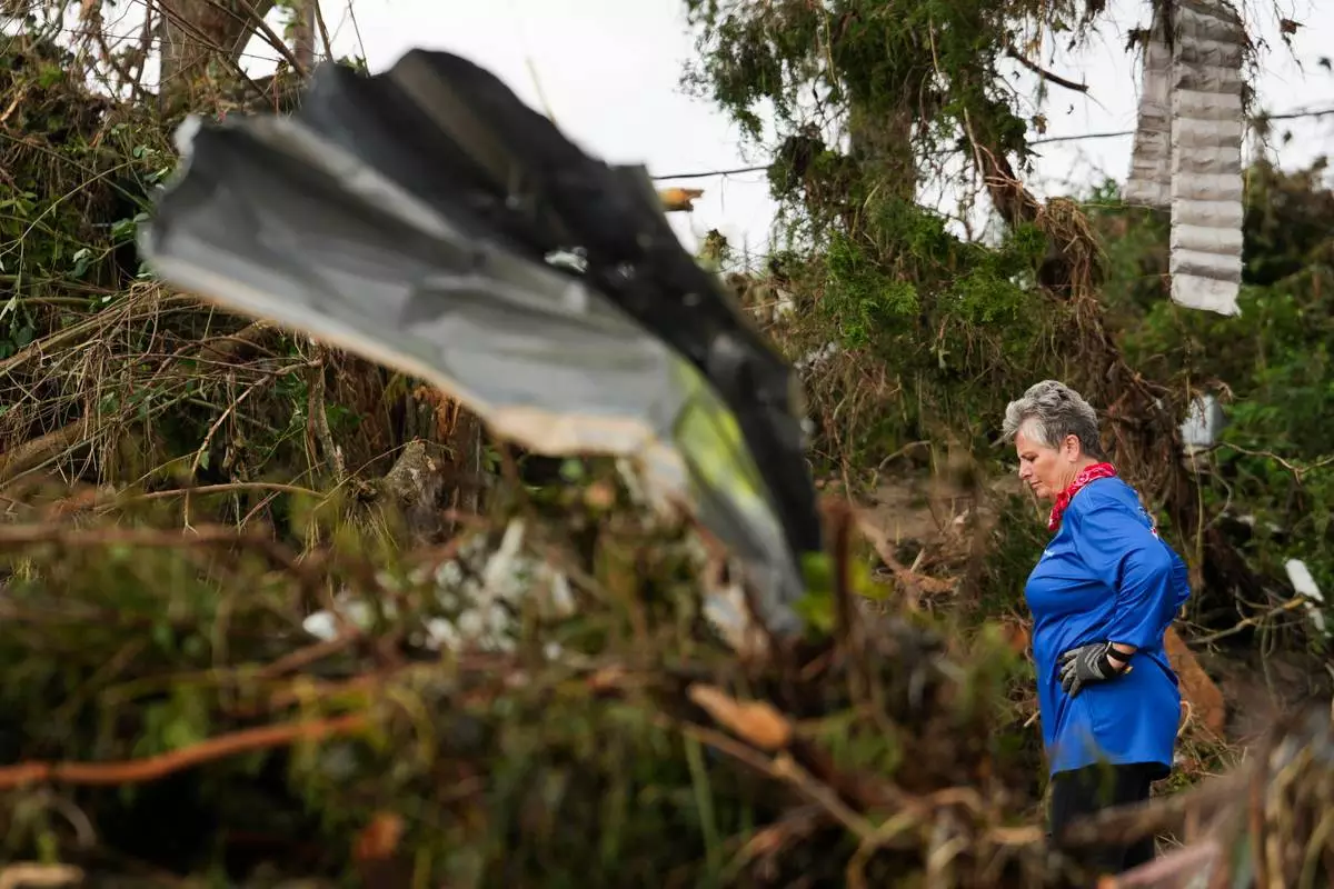 A woman and a teenage girl, both wearing rubber waders, briefly went inside one of the cabins, which stood next to a pile of soaked mattresses, a storage trunk and clothes. At one point, the pair doubled over, sobbing before they embraced.