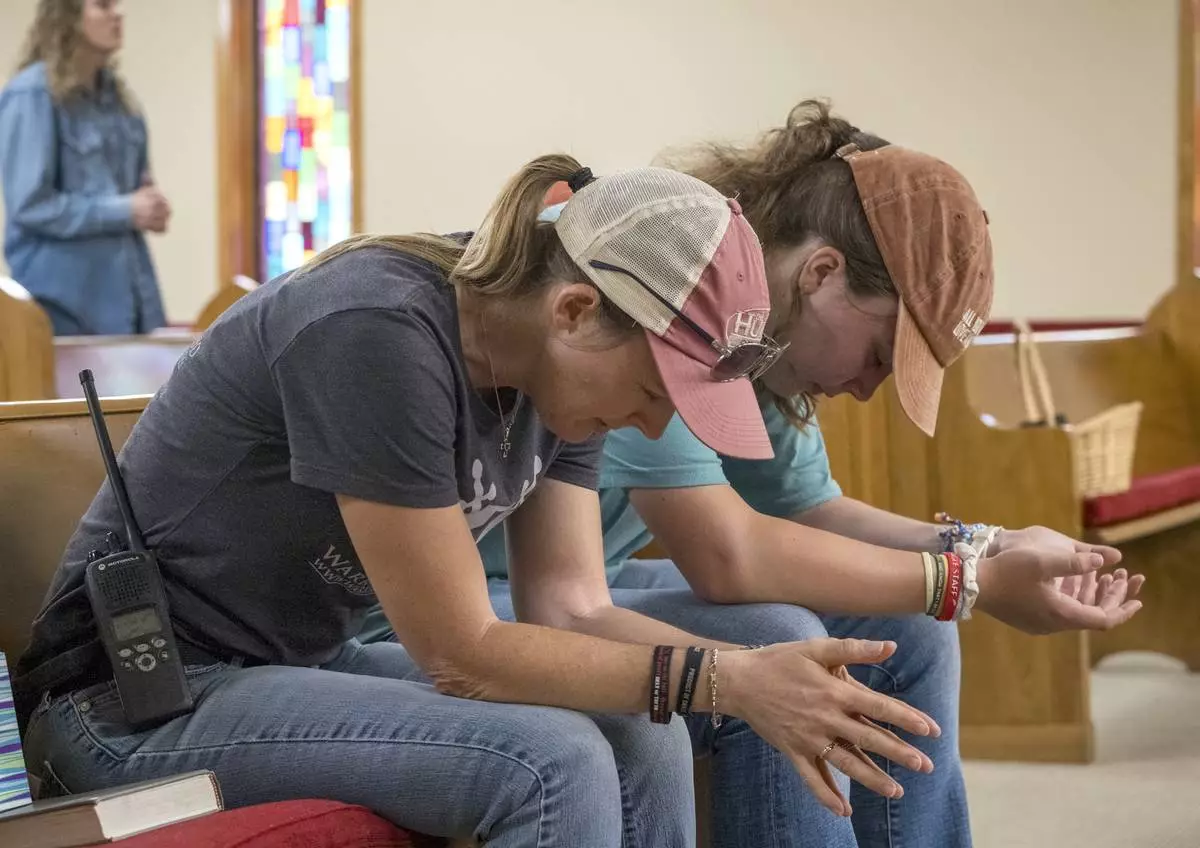Ginger Turner, and her daughter, Hailey, right, pray during church services held at the Hunt Baptist Church on Sunday, July 6, 2025, in Hunt, Texas. Their small town sits on the bank of the Guadalupe River and was severely damaged by recent flooding. (AP Photo/Rodolfo Gonzalez)