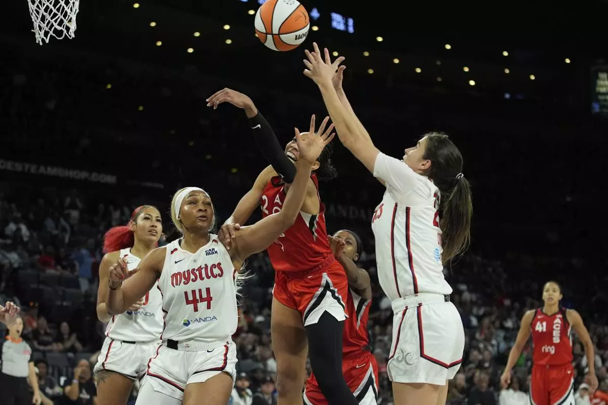 From right, Washington Mystics guard Sonia Citron (22), Las Vegas Aces center A'ja Wilson (22) and Washington Mystics forward Kiki Iriafen (44) battle for the ball during the second half of a WNBA basketball game Thursday, June 26, 2025, in Las Vegas. (AP Photo/John Locher)